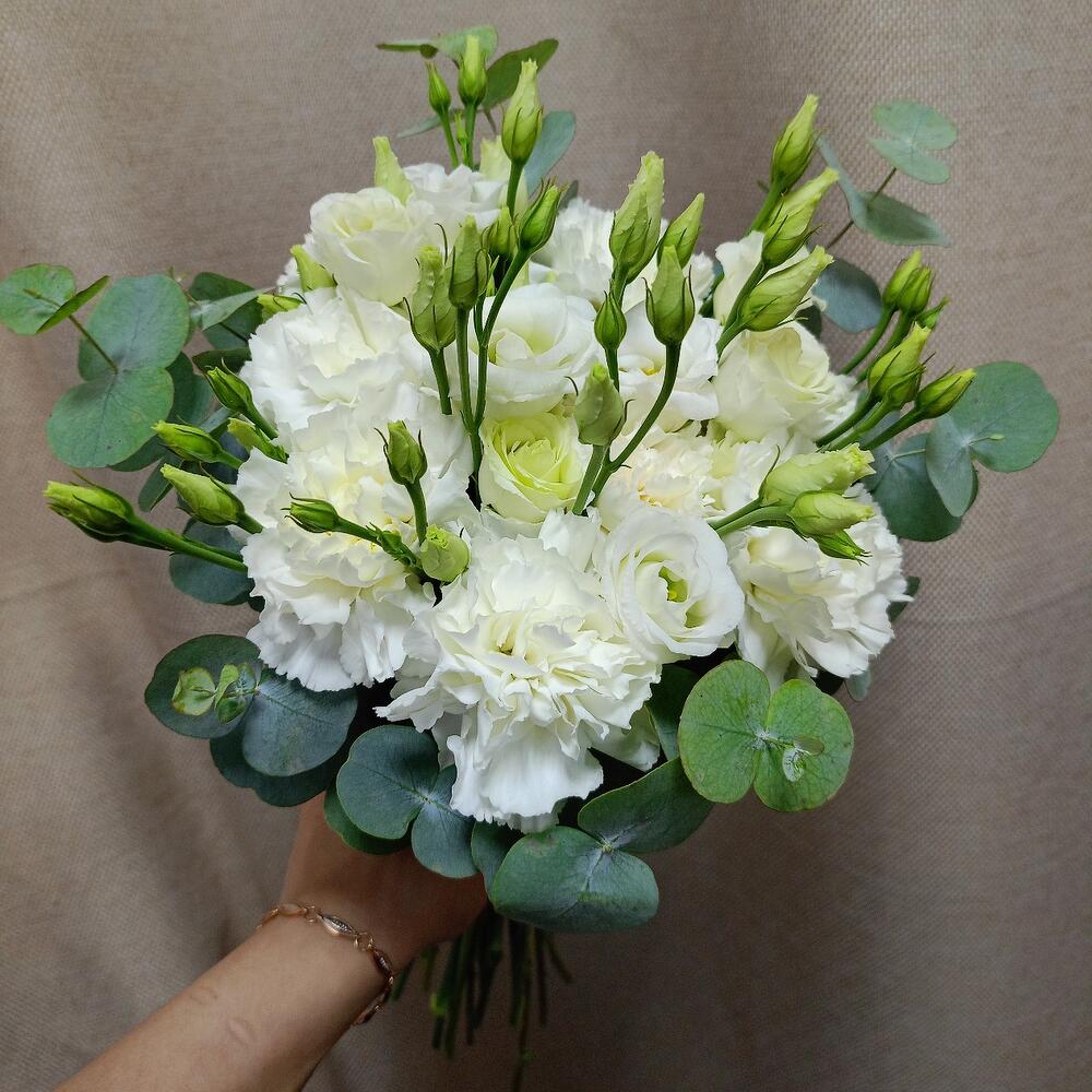 El eucalipto - 7 ud. Эустома - 15 ud. Cinta de raso - 2 ud. Диантус largos - 10 ud.