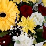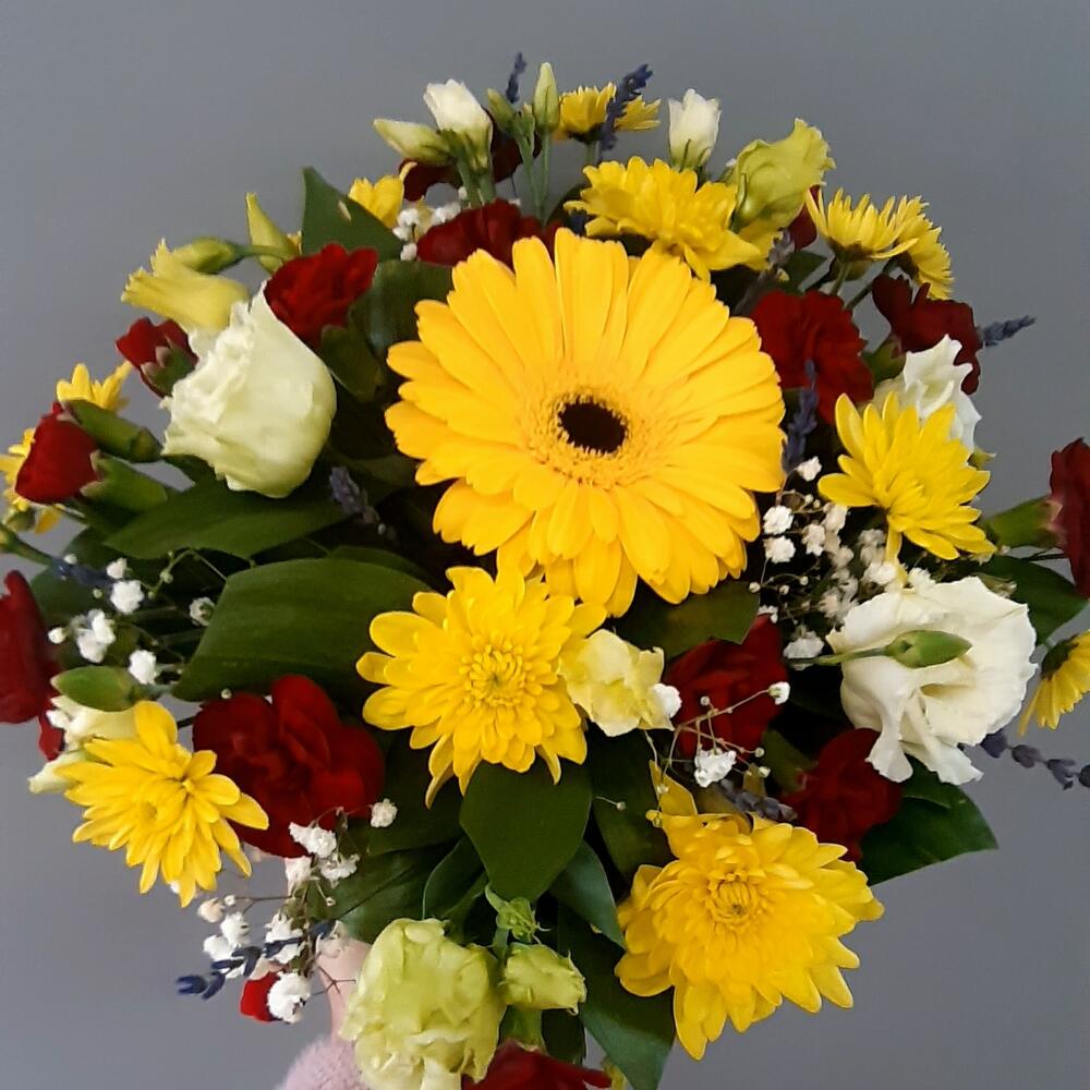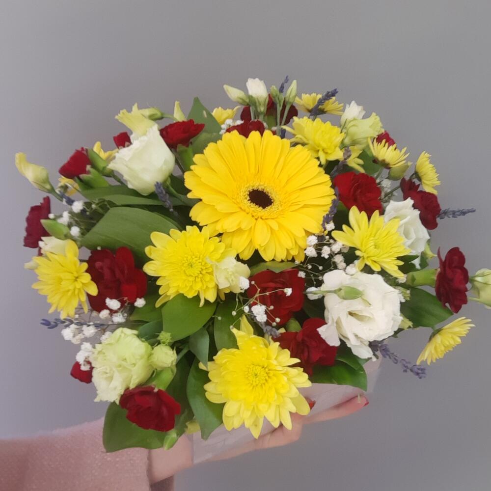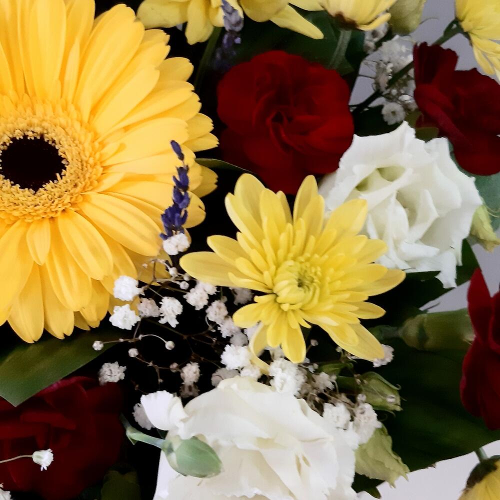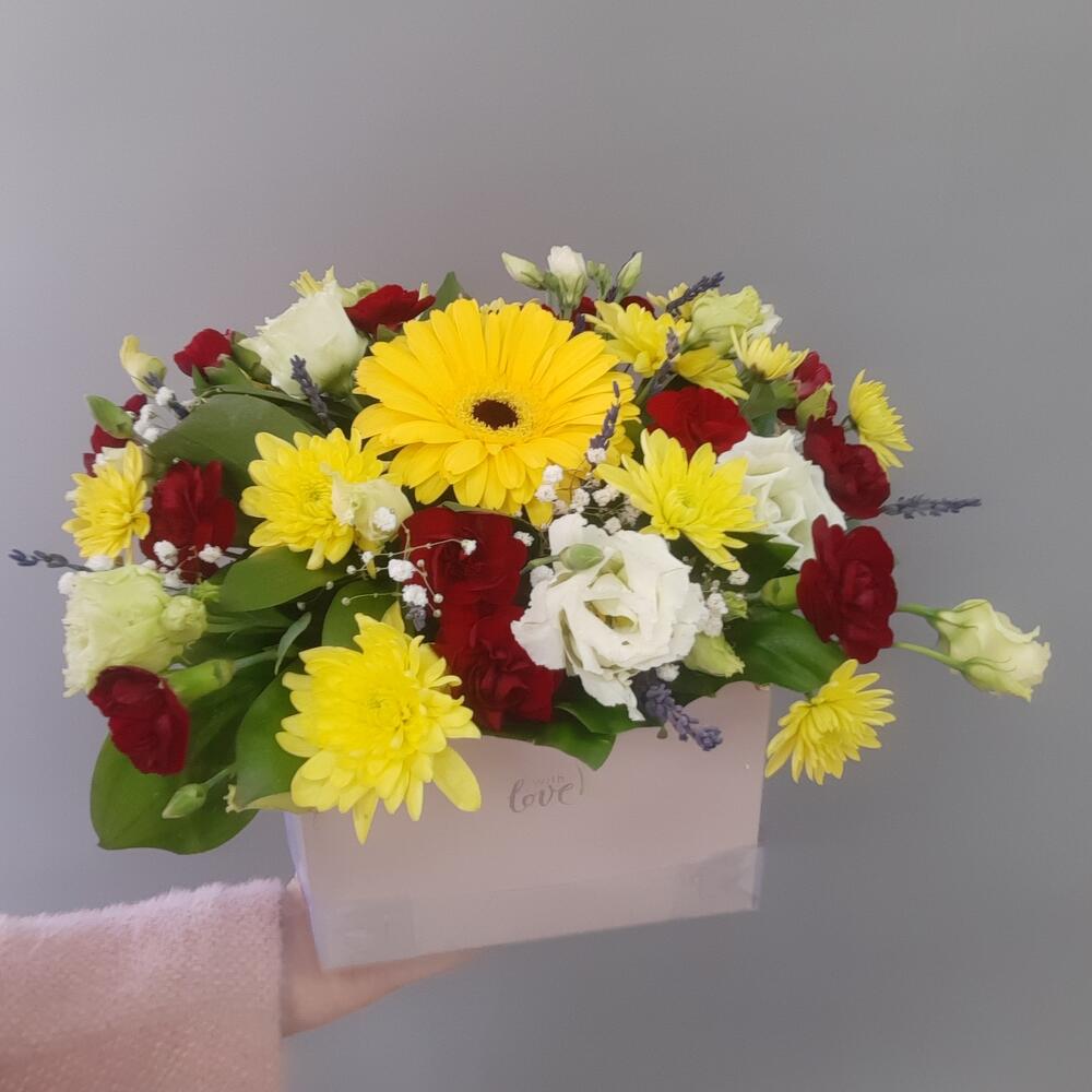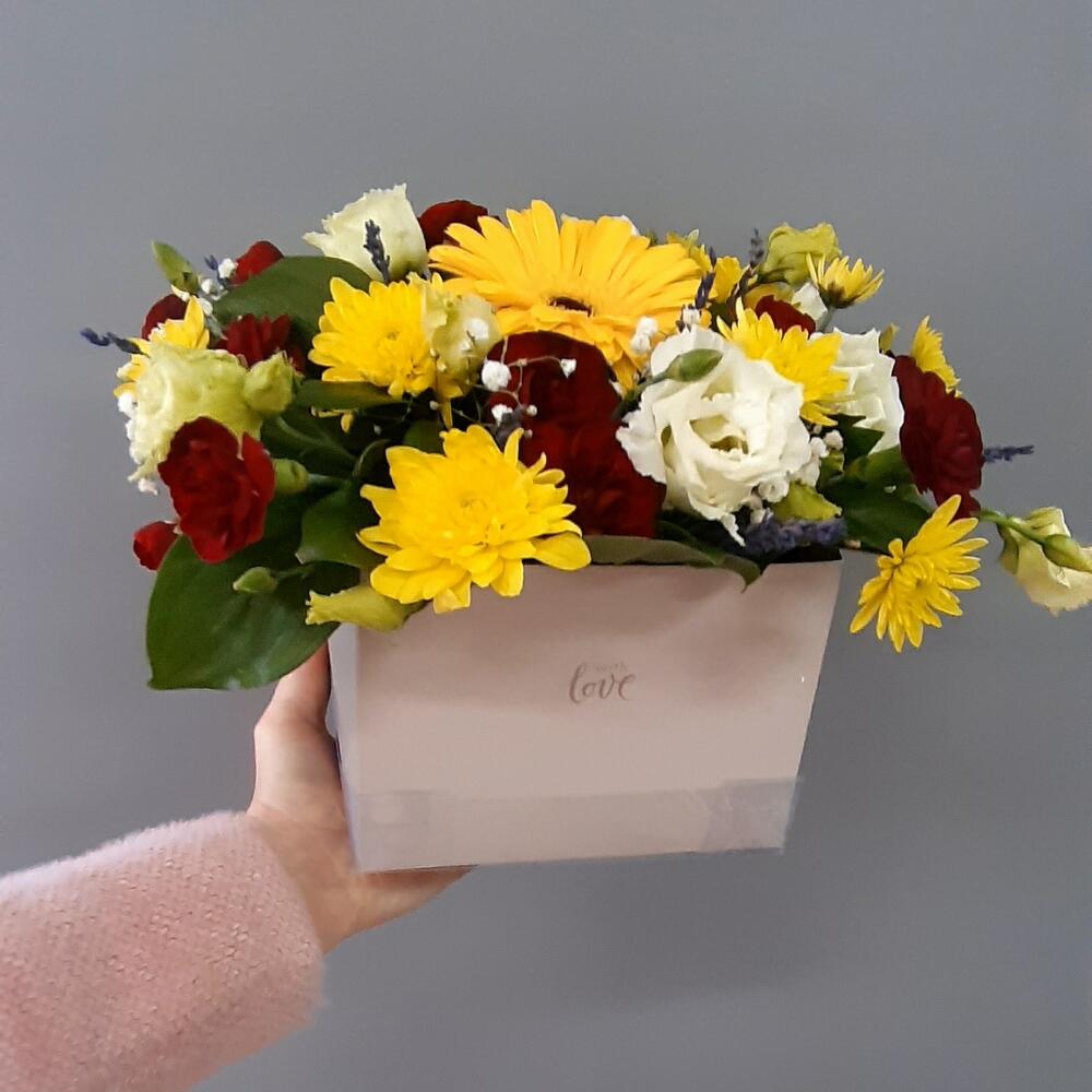 Lavanda (la siempreviva) - 11 ud. Rusco - 7 ud. Crisantemo кустовая - 2 ud. Эустома - 2 ud. Gerbera - 1 ud. El clavel кустовая - 5 ud. Caja - 1 ud. Un oasis asimismo, hay una floristería - 1 ud. гипсофила iris - 1 ud.