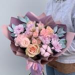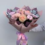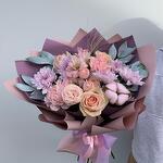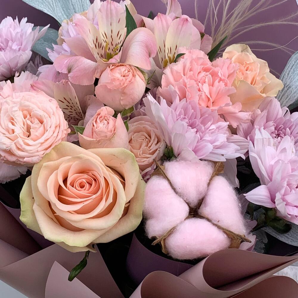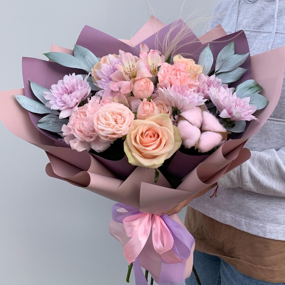 Rosa кустовая - 1 ud. Algodón - 1 ud. Crisantemo кустовая - 2 ud. Rosa - 3 ud. Cinta de raso - 2 ud. Диантус - 2 ud. Embalaje de diseño - 2 ud. covel ligamento - 1 ud. Ruscus - 3 ud. альстромерии - 1 ud.