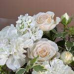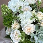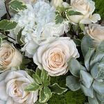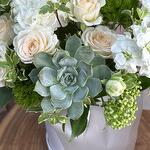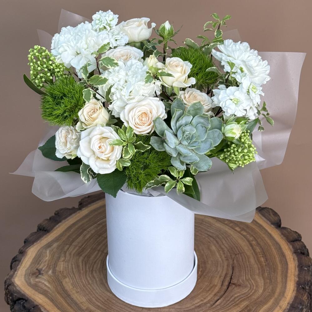 Маттиола - 2 ud. Питтоспорум - 1 ud. Кустовая rosa - 3 ud. El clavel - 3 ud. Caja de шляпная - 1 ud. Суккулент - 1 ud. Скиммия - 1 ud. Un oasis asimismo, hay una floristería - 1 ud.
