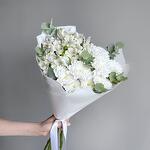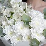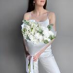 Нежный букет в белых тонах из очень стойких позиций: кустовой хризантемы, альстромерии и эвкалипта. Этот букет будет долго радовать своей красотой :) Не забудьте подрезать цветы НЕПОСРЕДСТВЕННО перед тем как ставить в вазу (после подрезки в течении 2-3 секунд поставьте в воду). Не храните букет на прямых солнечных лучах и возле отопительных приборов, чтобы сохранить цветы свежими как можно дольше. Обратите внимание на размеры букета и фото в полный рост с человеком, для понимания размера композиции, это фото есть в карточке товара :)