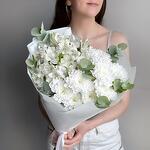 Нежный букет белая кустовая хризантема, альстромерия и эвкалипт