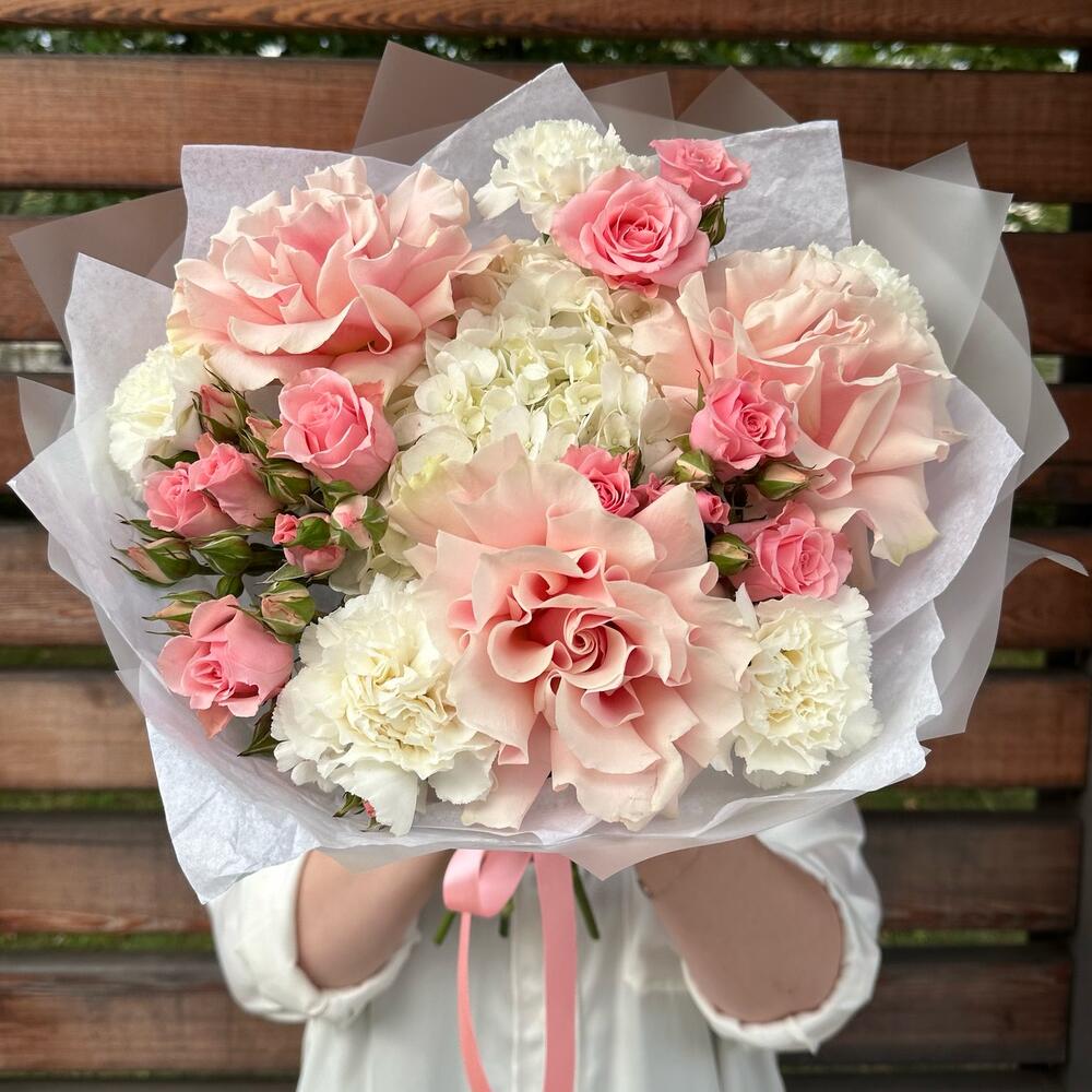 Нежный букет с гортензией, французскими розами, кустовыми розами и диантусами
