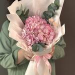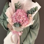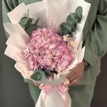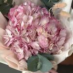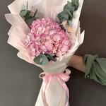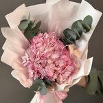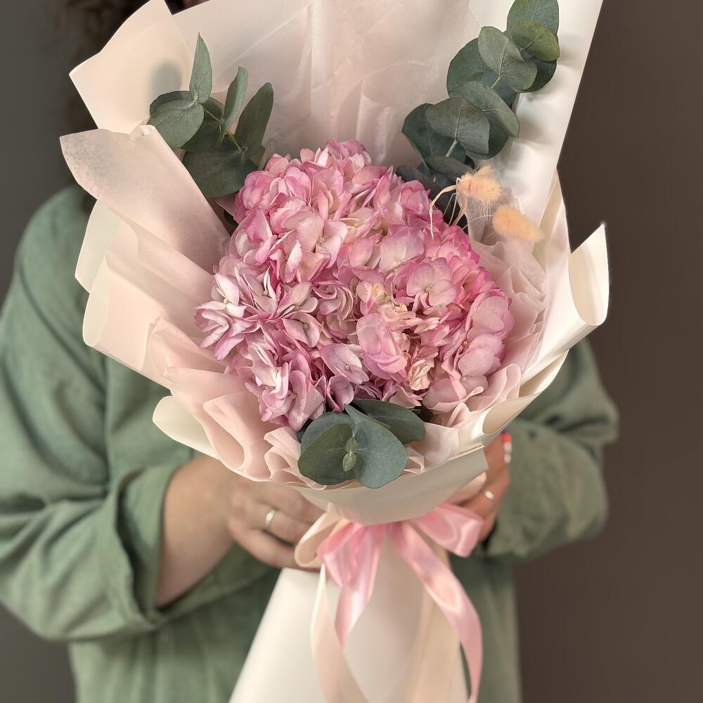 El eucalipto - 3 ud. Embalaje de diseño - 8 ud. Hortensia rosa - 1 ud. Лагурус (la siempreviva) - 3 ud. cinta de raso - 2 ud.