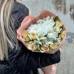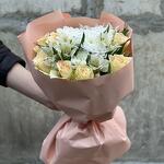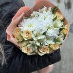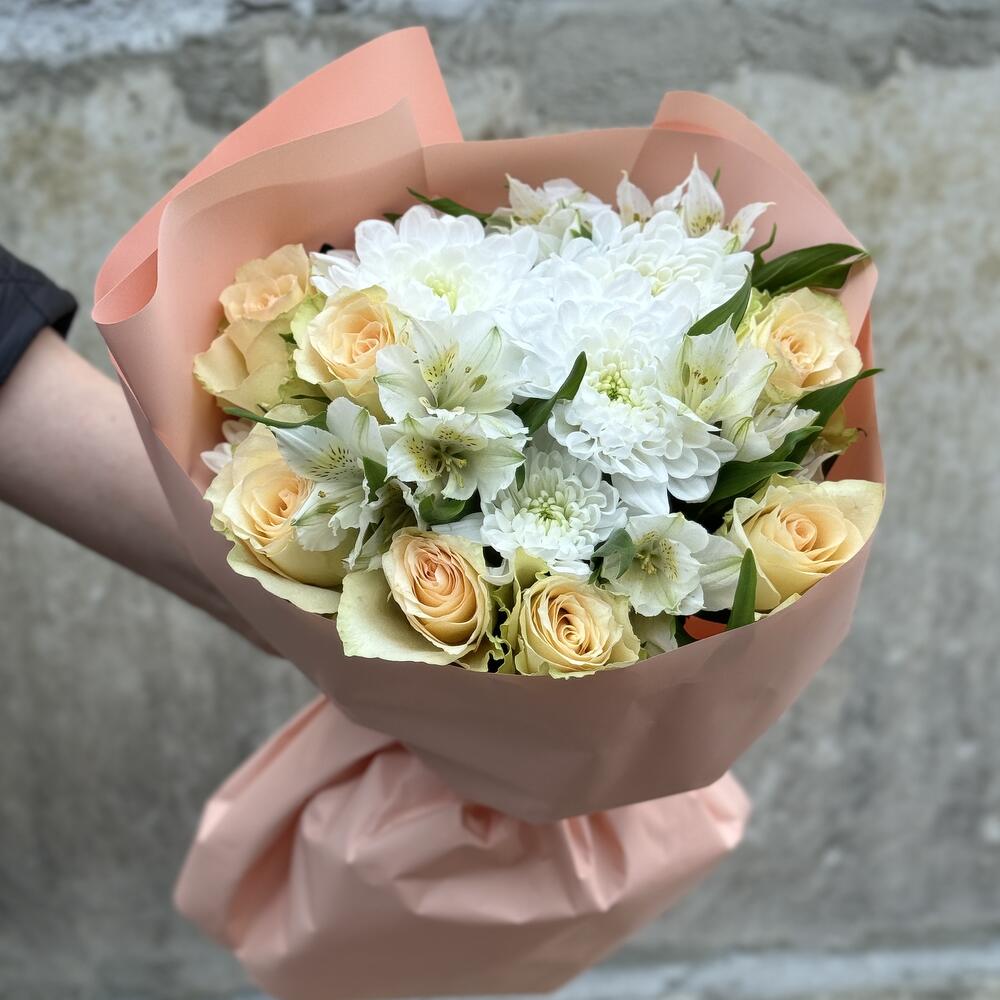 Альстромерия - 3 ud. Crisantemo кустовая - 1 ud. Embalaje - 1 ud. La cinta de seda - 1 ud. rosa Kenia - 7 ud.