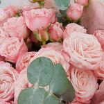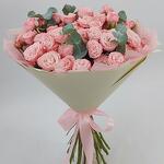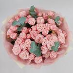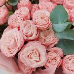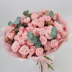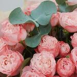 Ажурные пионовидные кустовые розочки с веточками эвкалипта. Такой букет всегда уместен и подойдёт для любого повода: День Рождения, именины, годовщина свадьбы, рождение ребенка, 8 марта, День Святого Валентина, выпускной и т.д. Можно вручить маме, сестре, подруге, коллеге, учителю, любимой.