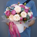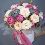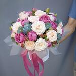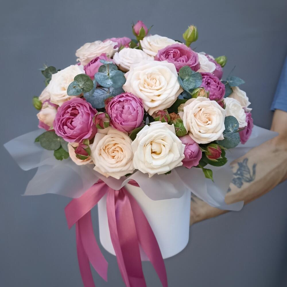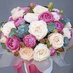 Данная композиция из кустовых пионовидных роз в малиновом и нежно-розовом цвете, ароматного эвкалипта, украшенная атласными лентами подойдёт в качестве подарка для любого торжества и украсит интерьер.