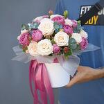El eucalipto - 4 ud. Cinta de raso - 1 ud. Rosa пионовидная кустовая misty bubbles - 9 ud. Un oasis asimismo, hay una floristería - 1 ud. Rosa кустовая пионовидная бомбастик - 8 ud. El cilindro de cartón - 1 ud.