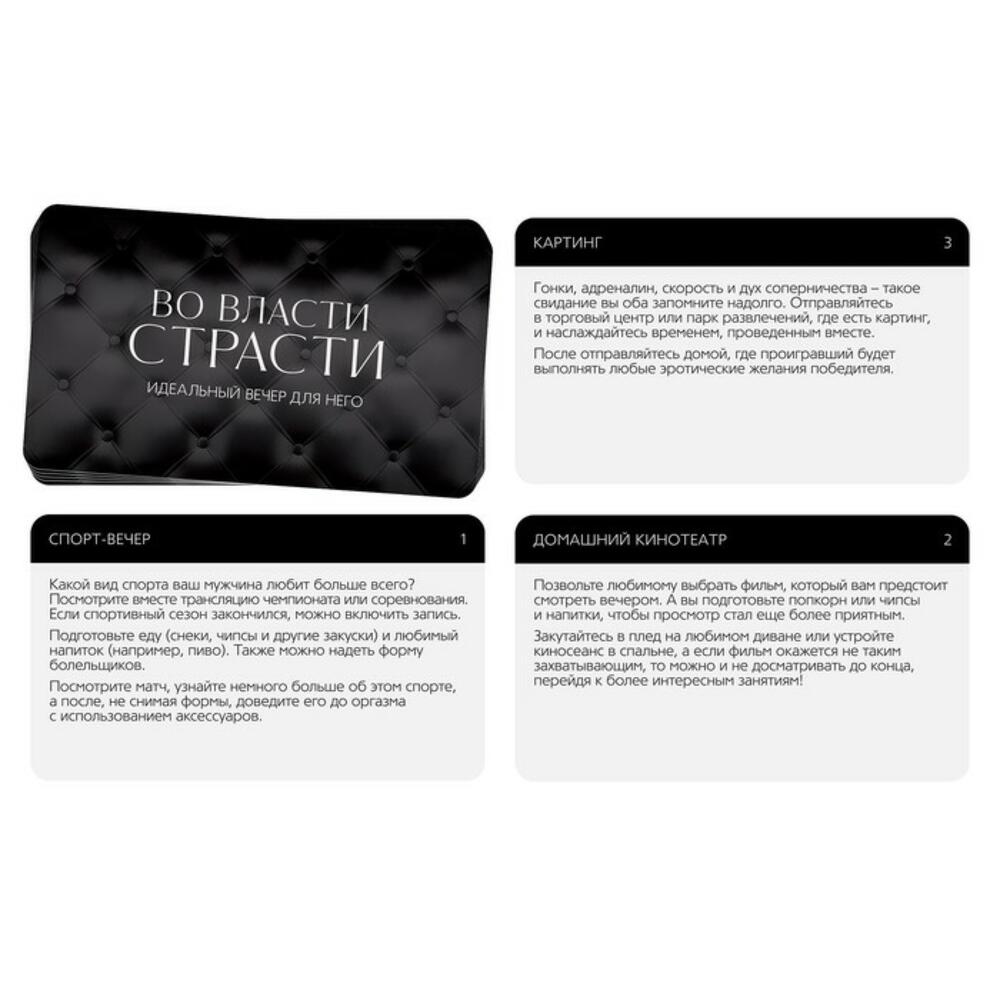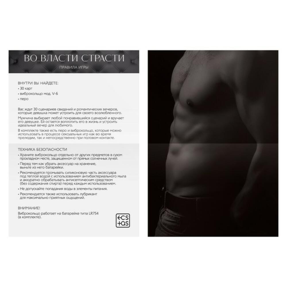 Окажитесь во власти страсти «Во власти страсти» – это серия эротических игр для двоих, главная особенность которой – большое количество ролевых игр и сценариев проведения романтического вечера. Серия включает себя карточные игры, наборы с аксессуарами, наборы кубиков и т.д. Мечтаете порадовать любимого и устроить ему незабываемое свидание? В этой коробке вас ждёт 30 вариантов свиданий, каждое из которых приведёт вас к оргазму! Ничего не нужно придумывать, мы уже всё сделали. Осталось только воплотить идею в жизнь. Как пользоваться набором? В комплекте вас ждёт 30 карточек-заданий, а это целых 30 свиданий и романтических вечеров, которые девушка может устроить для своего возлюбленного. Мужчина внимательно изучает карточки и выбирает любую понравившуюся. Задача девушки – воплотить её в жизнь и устроить романтическое свидание для любимого. Закончиться оно должно сексом в вашей постели или любом другом месте. В комплекте также есть виброкольцо и перо, которые можно взять с собой на свидание.