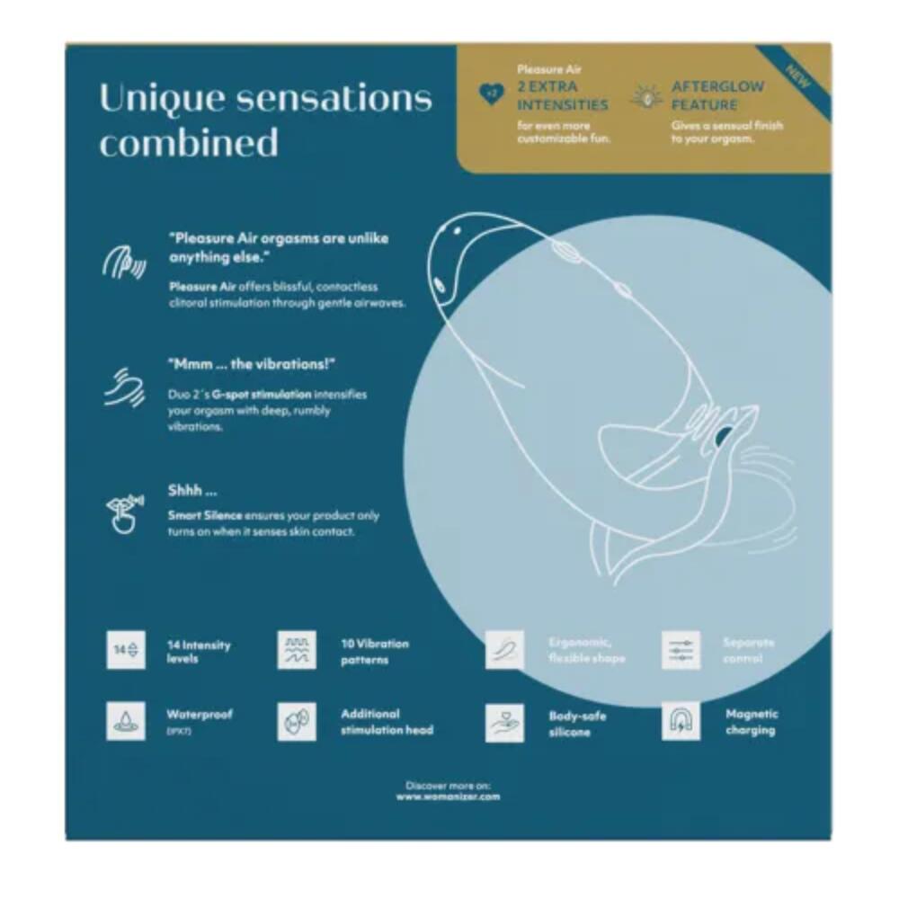 DUO 2 — это уникальная игрушка-кролик премиум-класса, сочетающая в себе клиторальный стимулятор Pleasure Air и мощный вибратор G-Spot. Pleasure Air окружает клитор пульсирующими волнами и нежным всасыванием, что приводит к незабываемым ощущениям. Гибкая внутренняя часть изогнута вверх, чтобы воздействовать на точку G. Модель имеет 10 различных вибрационных паттернов и 14 уровней интенсивности. Игрушка является водонепроницаемой (IPX7) и имеет технологию Smart Silence — автоматически отключается, если не контактирует с кожей.