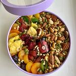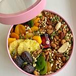 La ciruela - 5 ud. Almendras - 150 gr La miel soufflé - 1 ud. Piña seca - 3 ud. fruta seca de kiwi - 4 ud. персики вяленые - 100 gr fechas reales - 2 ud. semillas de calabaza - 30 gr аива - 150 gr