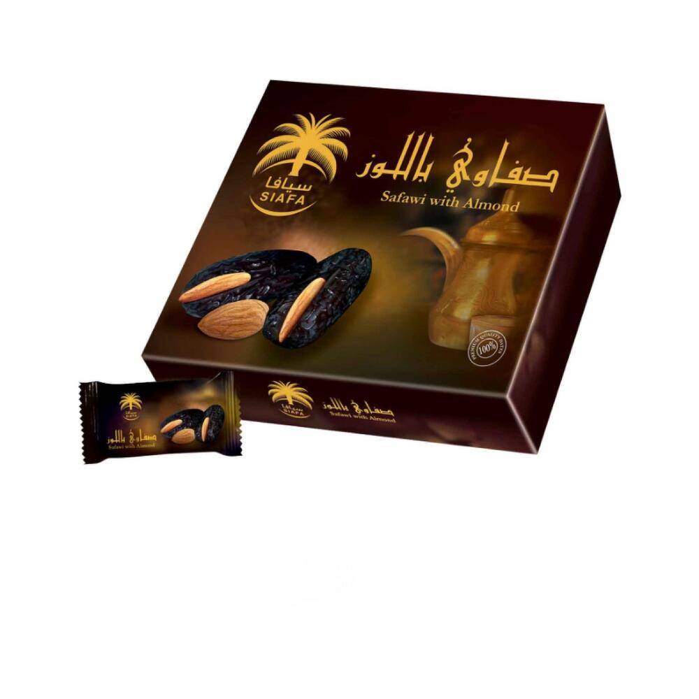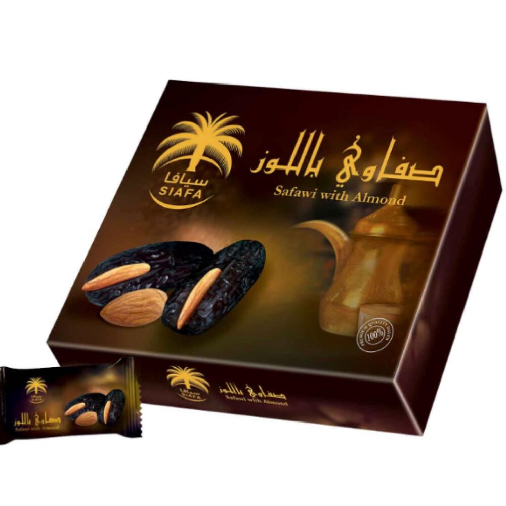 Финики Сафави с миндалем от топовой фабрики Siafa - это почти как чернослив с миндалем, только с более богатой игрой вкусов и послевкусий. Миндальный аромат гармонично вплетается в тонкий, интеллигентный вкус Сафави, где можно уловить и черносливовые нотки, и легкие кофейные оттенки. Послевкусие Сафави не такое сладкое, как у остальных фиников, поэтому такой десерт можно есть бесконечно долго. Ну, или пока коробочка не опустеет.