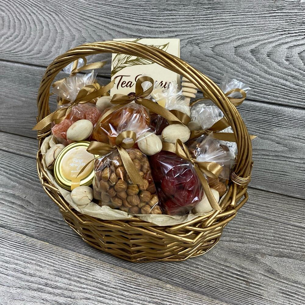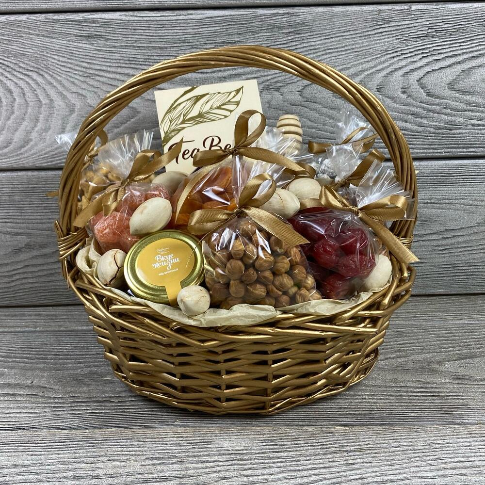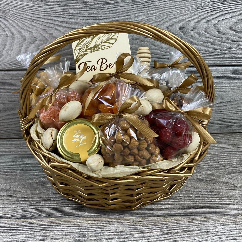 Castañas de cajú - 90 gr La miel - 150 gr Almendras - 90 gr Las avellanas - 90 gr Orejones - 90 gr вишня сушеная - 90 gr cacahuetes en sésamo - 90 gr кумкват сушеный - 90 gr fresa seca - 90 gr cuchara de miel - 1 ud. орех пекан в скорлупе - 20 gr чай листовой tea berry - 1 ud.