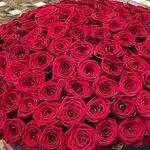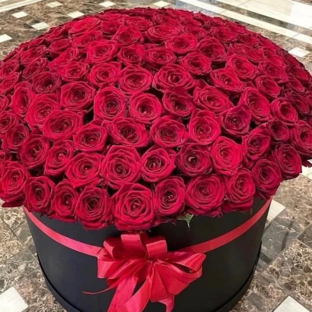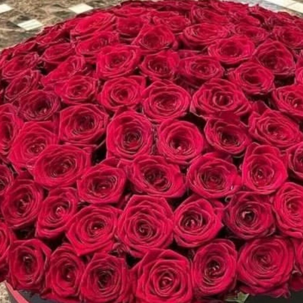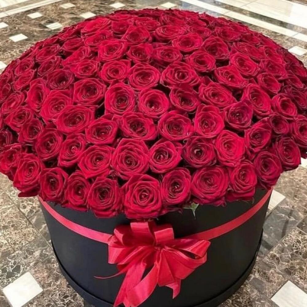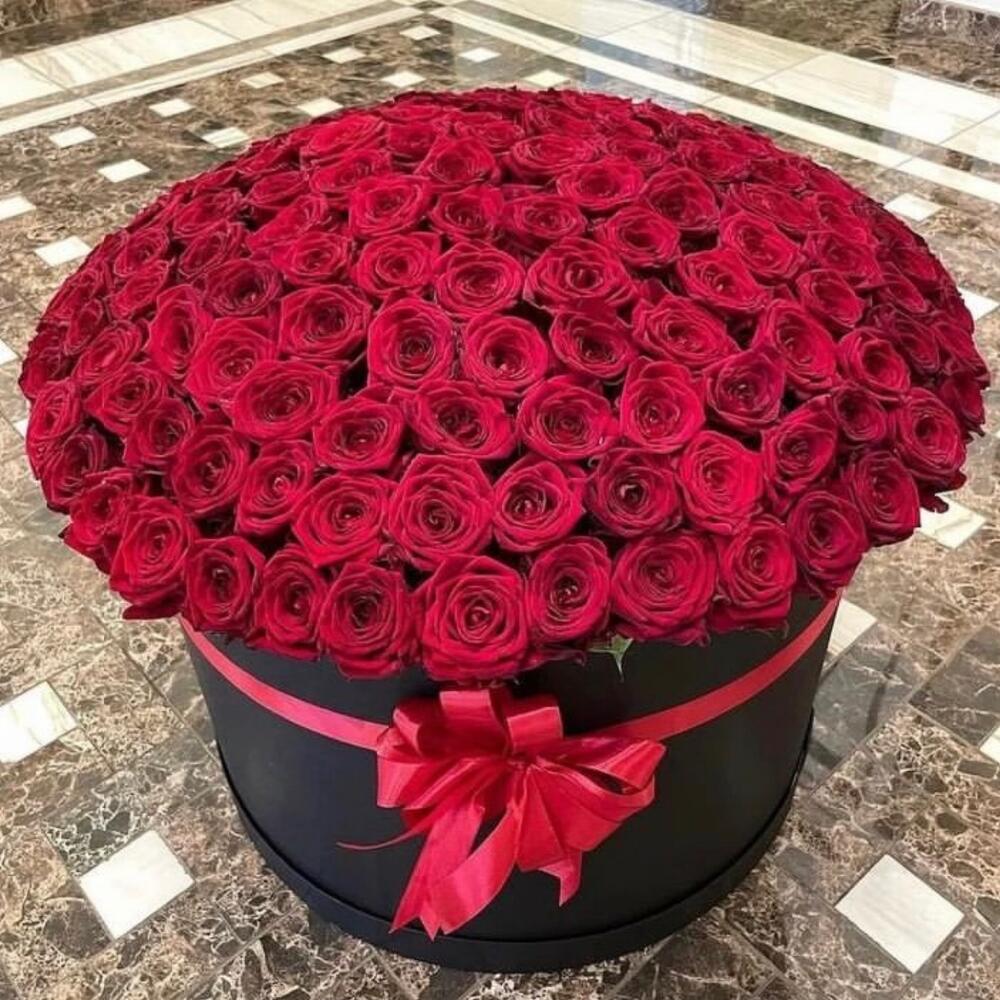 Лента атласная - 1 шт. Коробка шляпная - 1 шт. Красная роза - 101 шт. Оазис флористический - 6 шт.