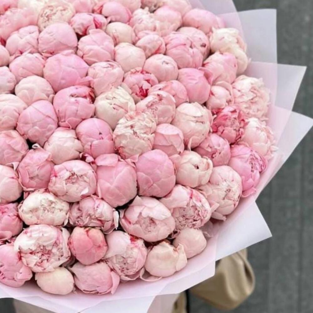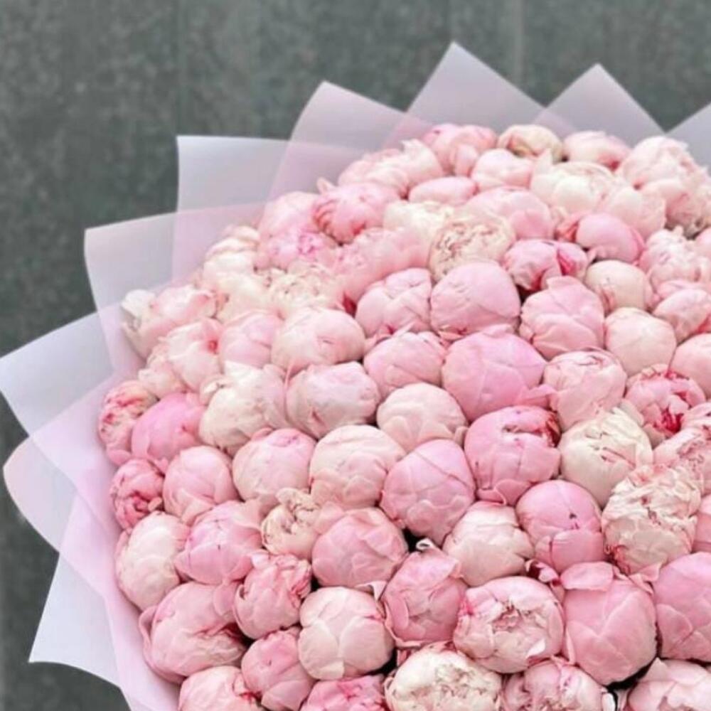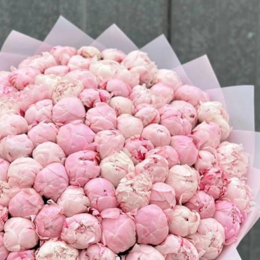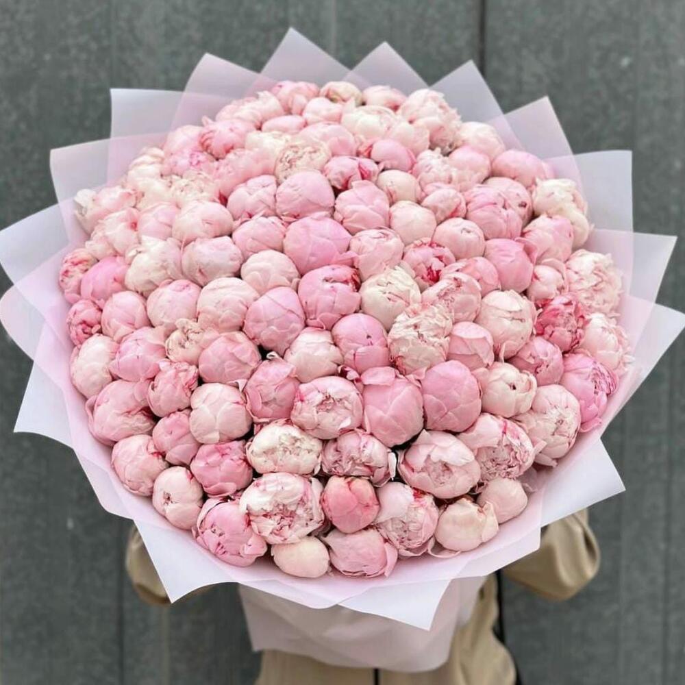 Лента атласная - 1 шт. Упаковка дизайнерская - 1 шт. Открыточка с вашими пожеланиями - 1 шт. пионы - 101 шт. прекрасное настроение - 1000 шт.