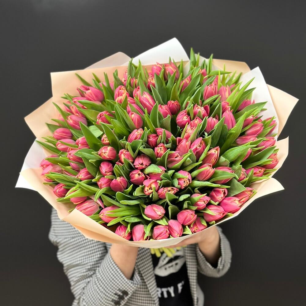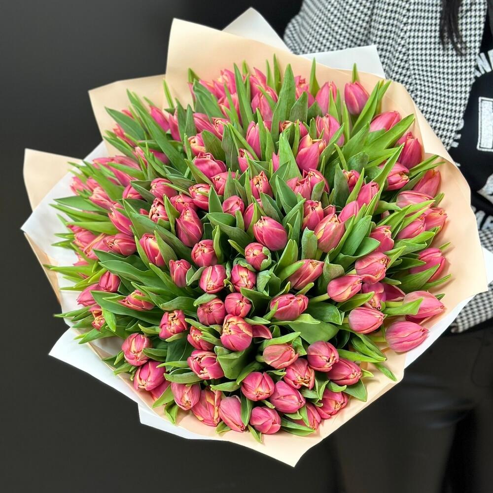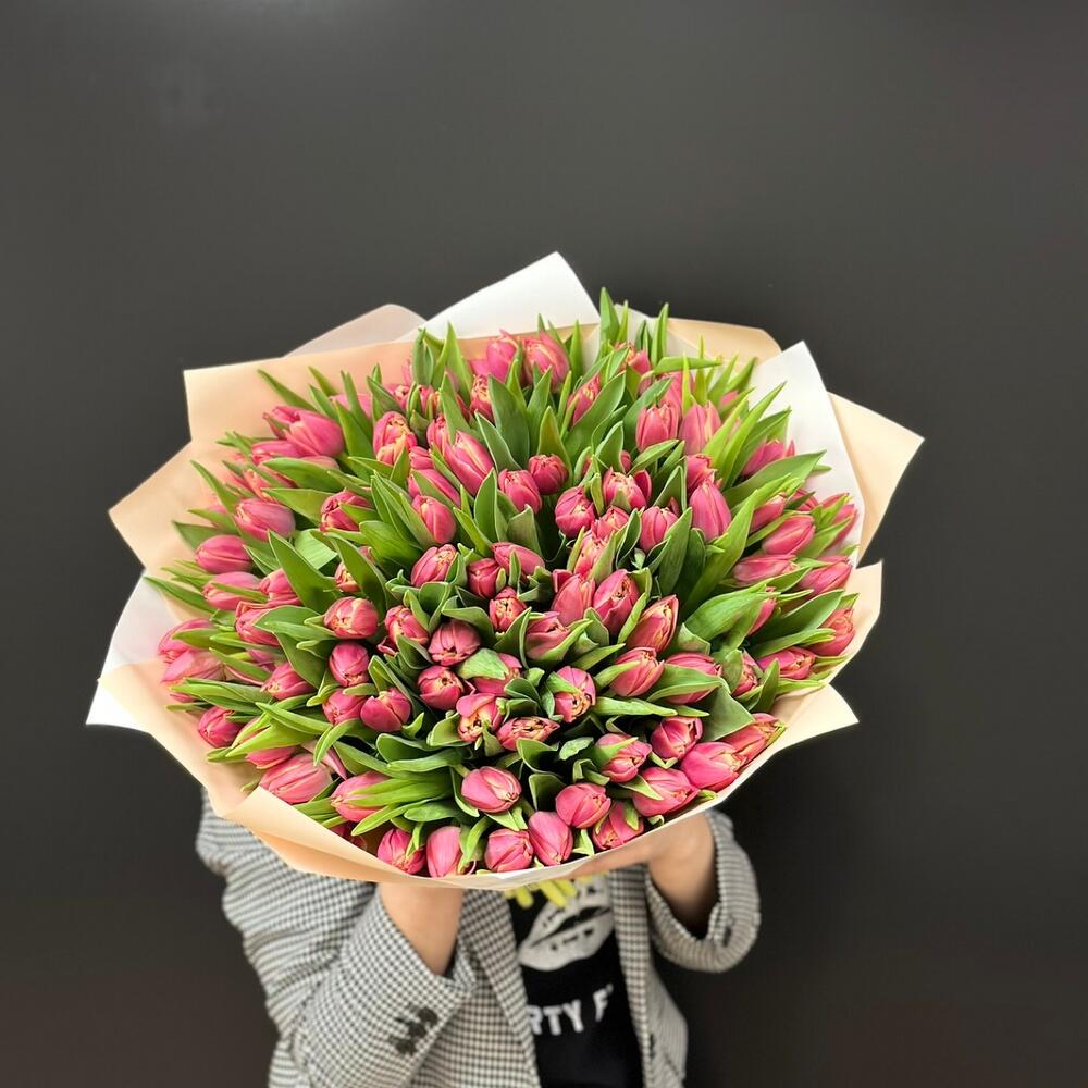 Лента атласная - 1 шт. Тюльпан пионовидный - 101 шт. Упаковка дизайнерская - 1 шт.