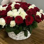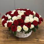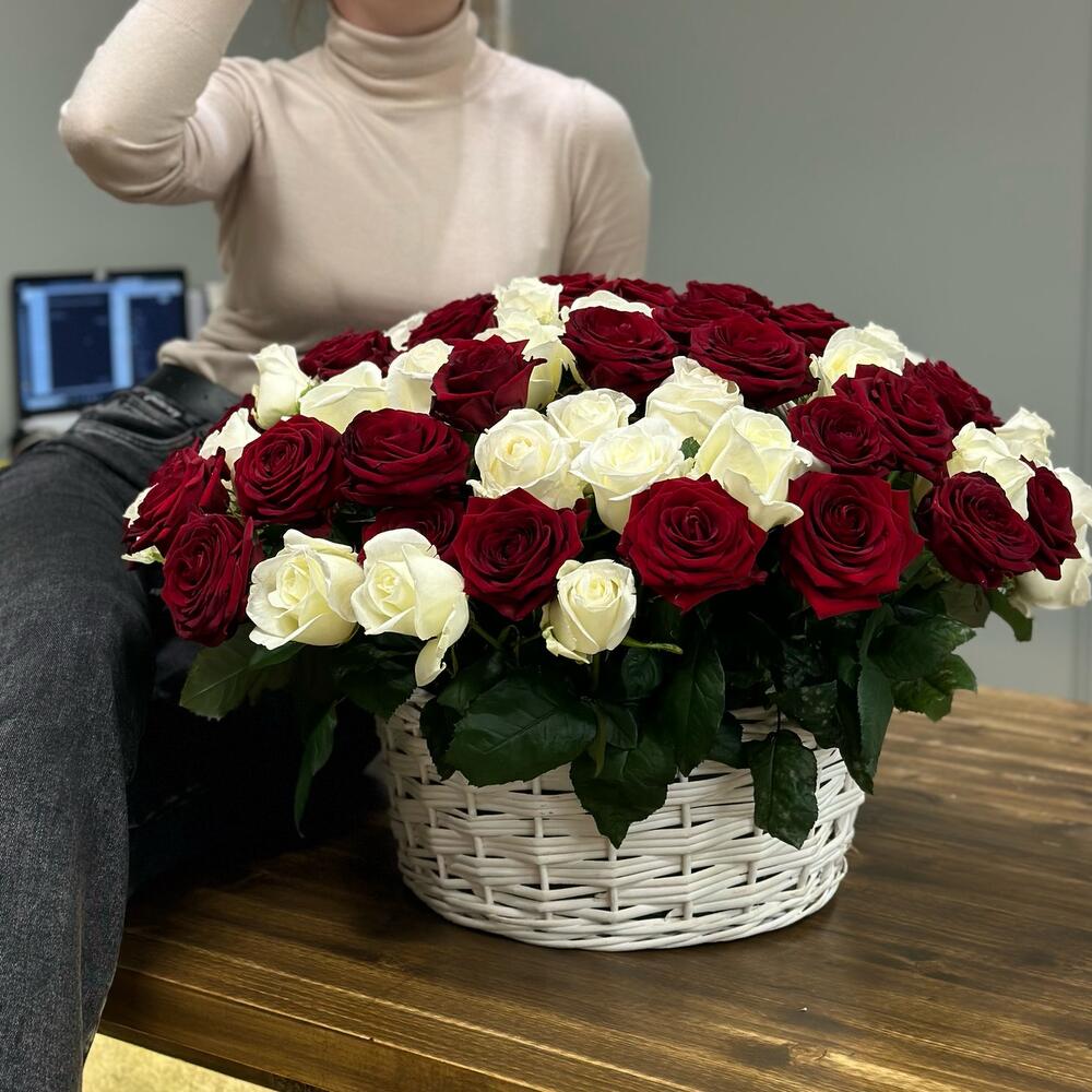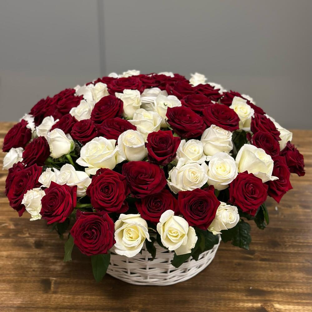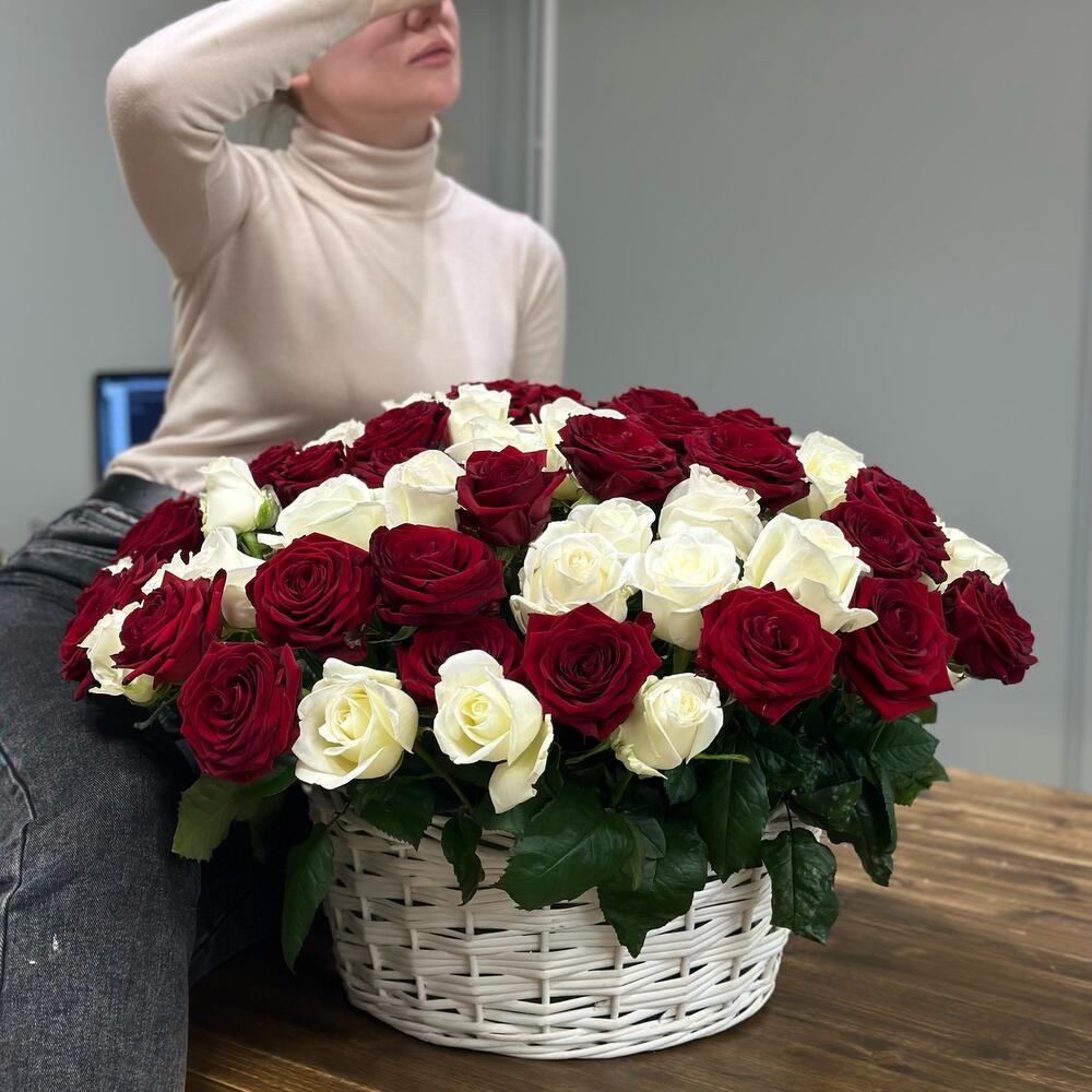 Роза - 101 шт. Корзина плетеная - 1 шт. Оазис флористический - 6 шт.