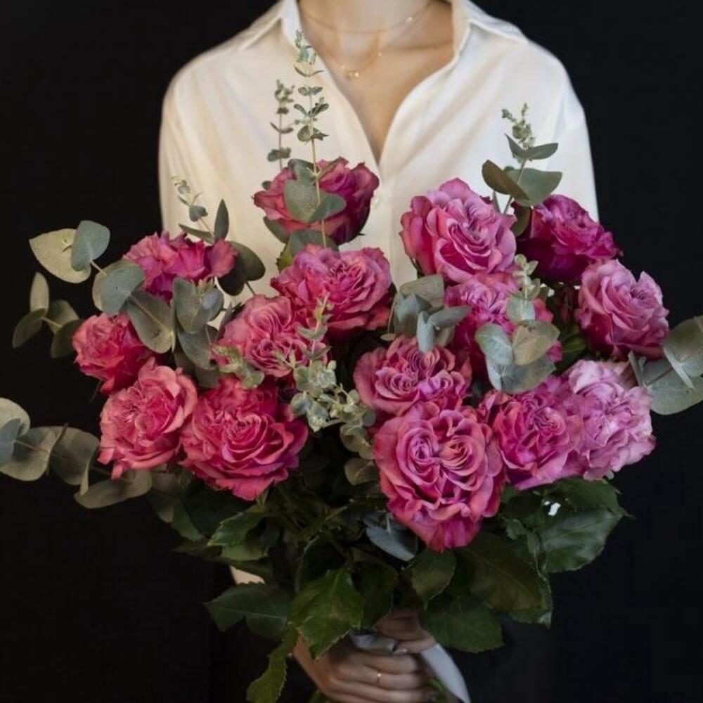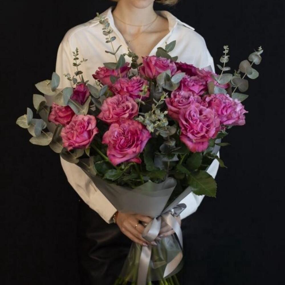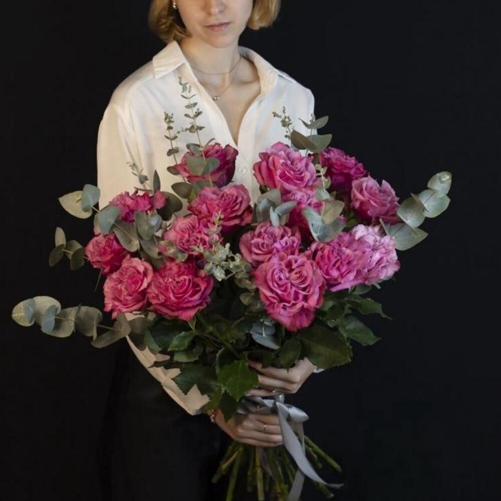 Эвкалипт - 11 шт. Пионовидная роза - 15 шт. Атласная лента - 1 шт.