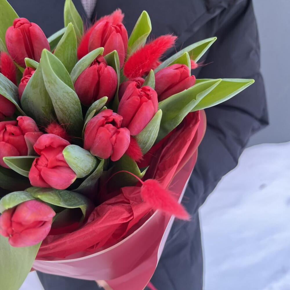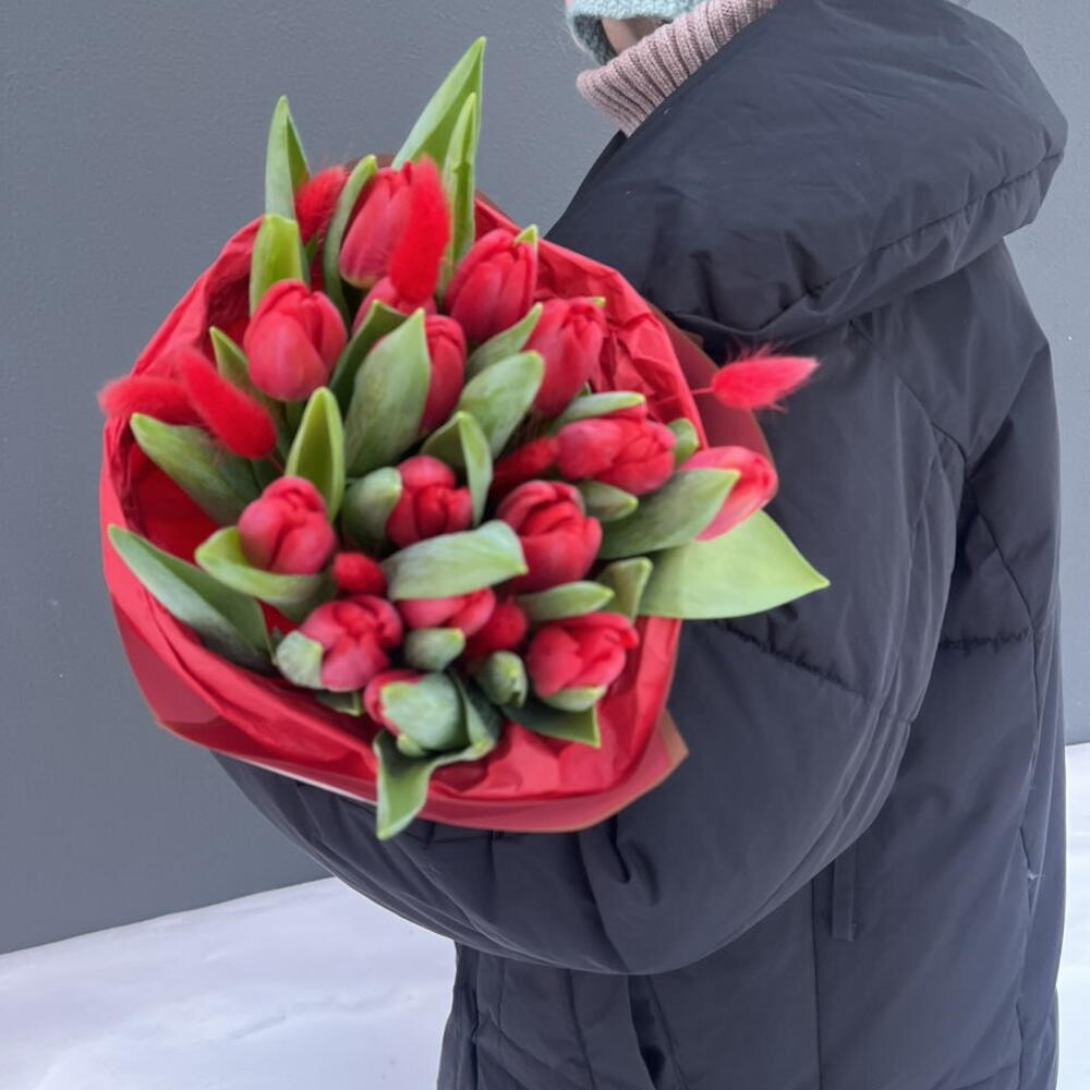 Упаковка - 1 шт. Тюльпан красный - 15 шт. Лагурус - 10 шт.