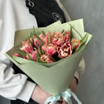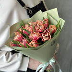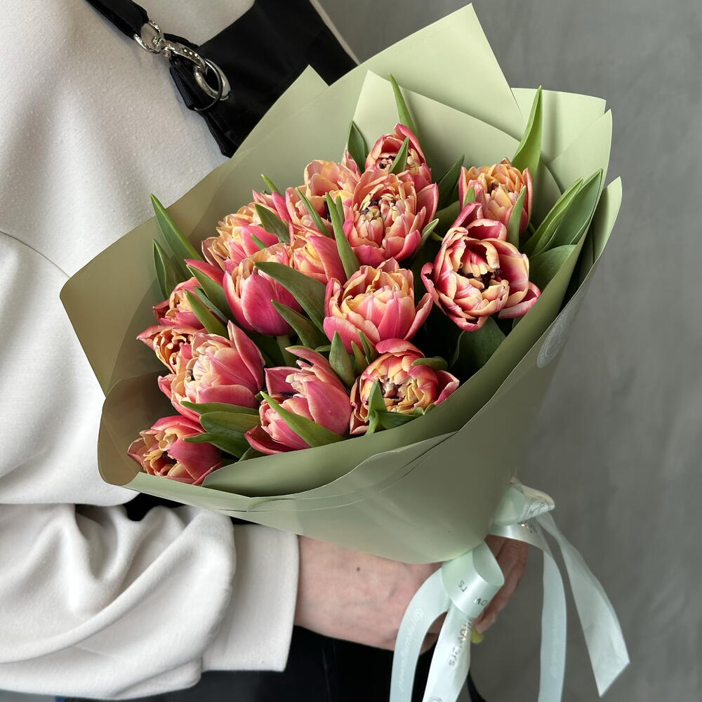 Лента атласная - 2 шт. Тюльпан Пионовидный - 15 шт. Упаковка дизайнерская - 2 шт.
