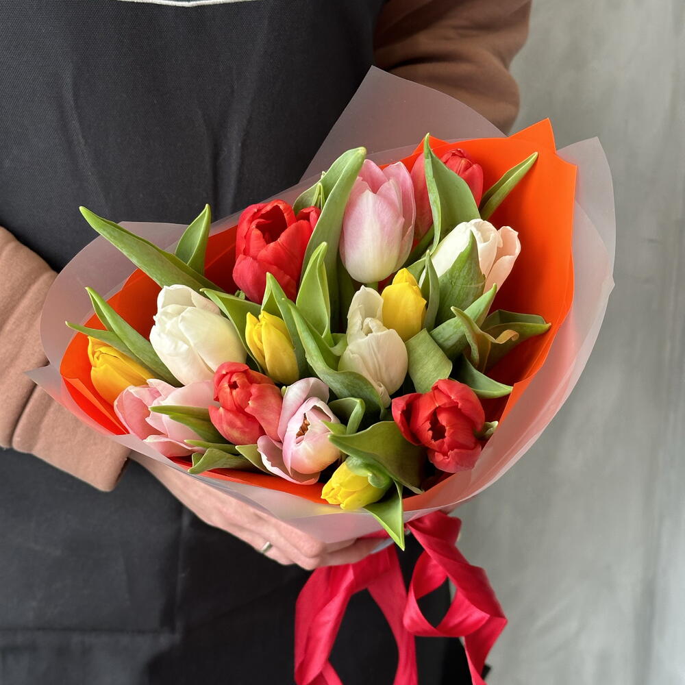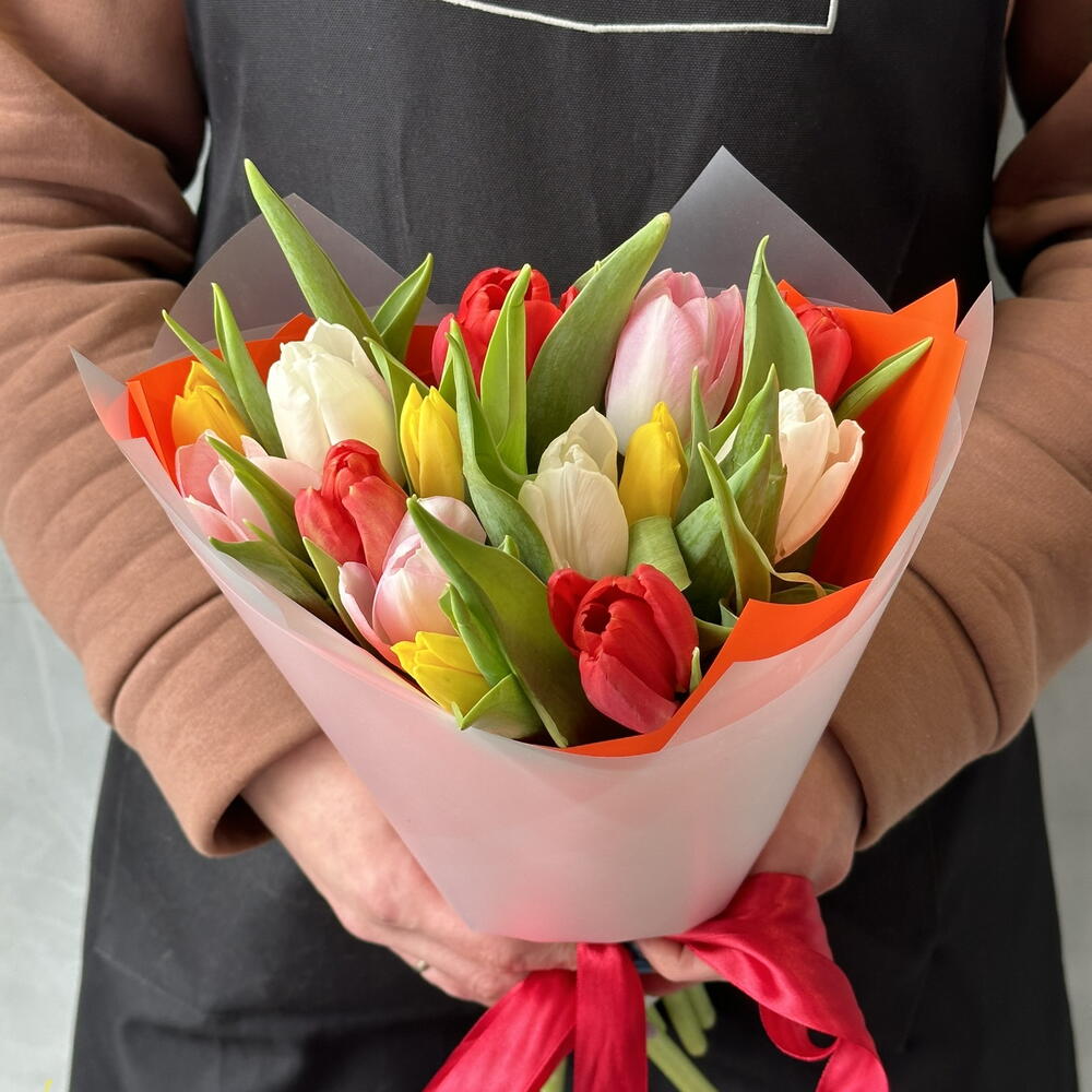 Лента атласная - 2 шт. Упаковка дизайнерская - 2 шт. Тюльпан Голландский - 15 шт.
