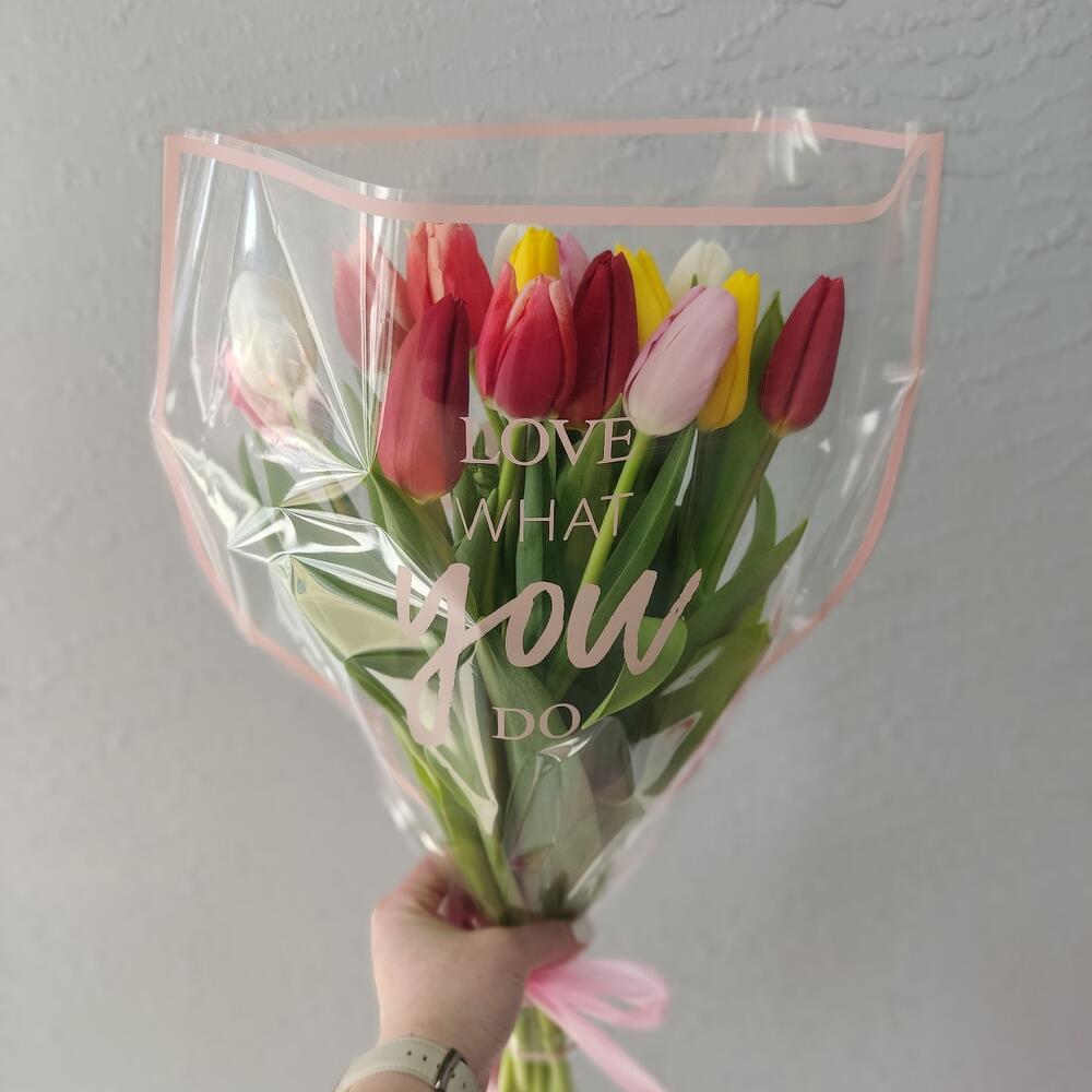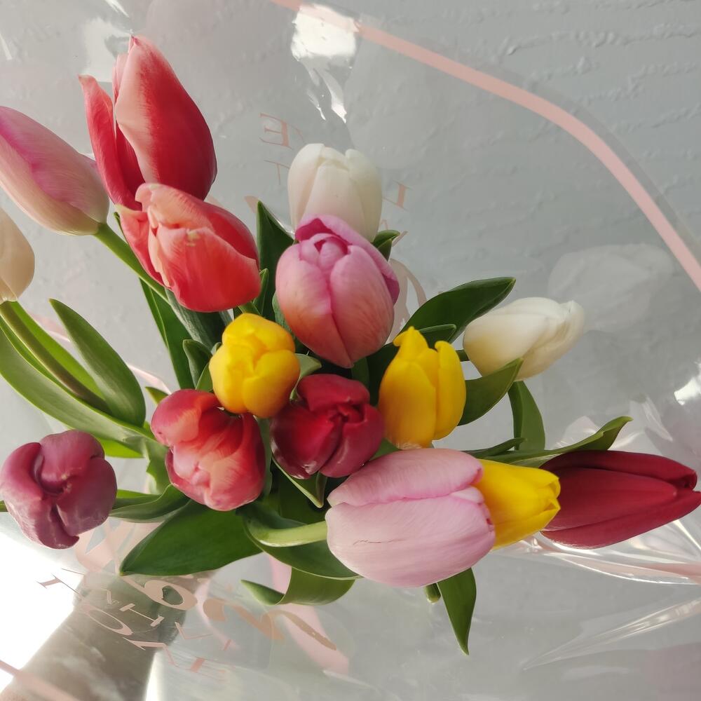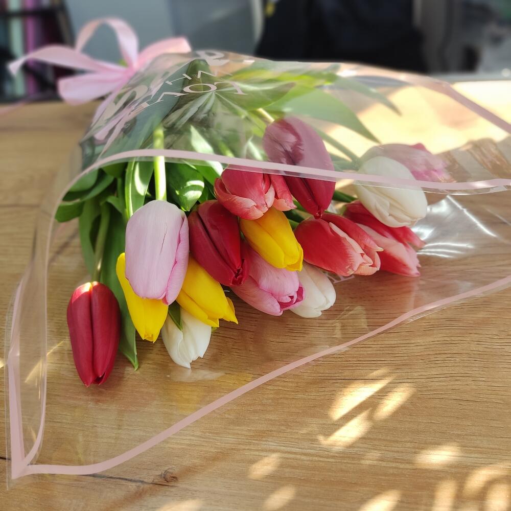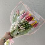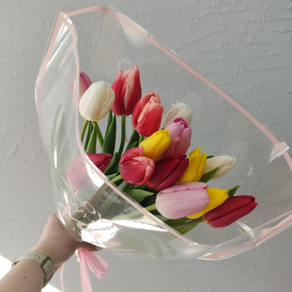 Тюльпан - 15 шт. Лента атласная - 1 шт. Упаковка дизайнерская - 1 шт.