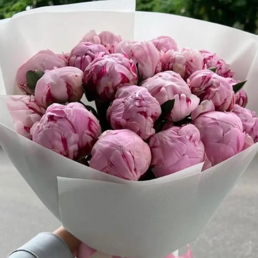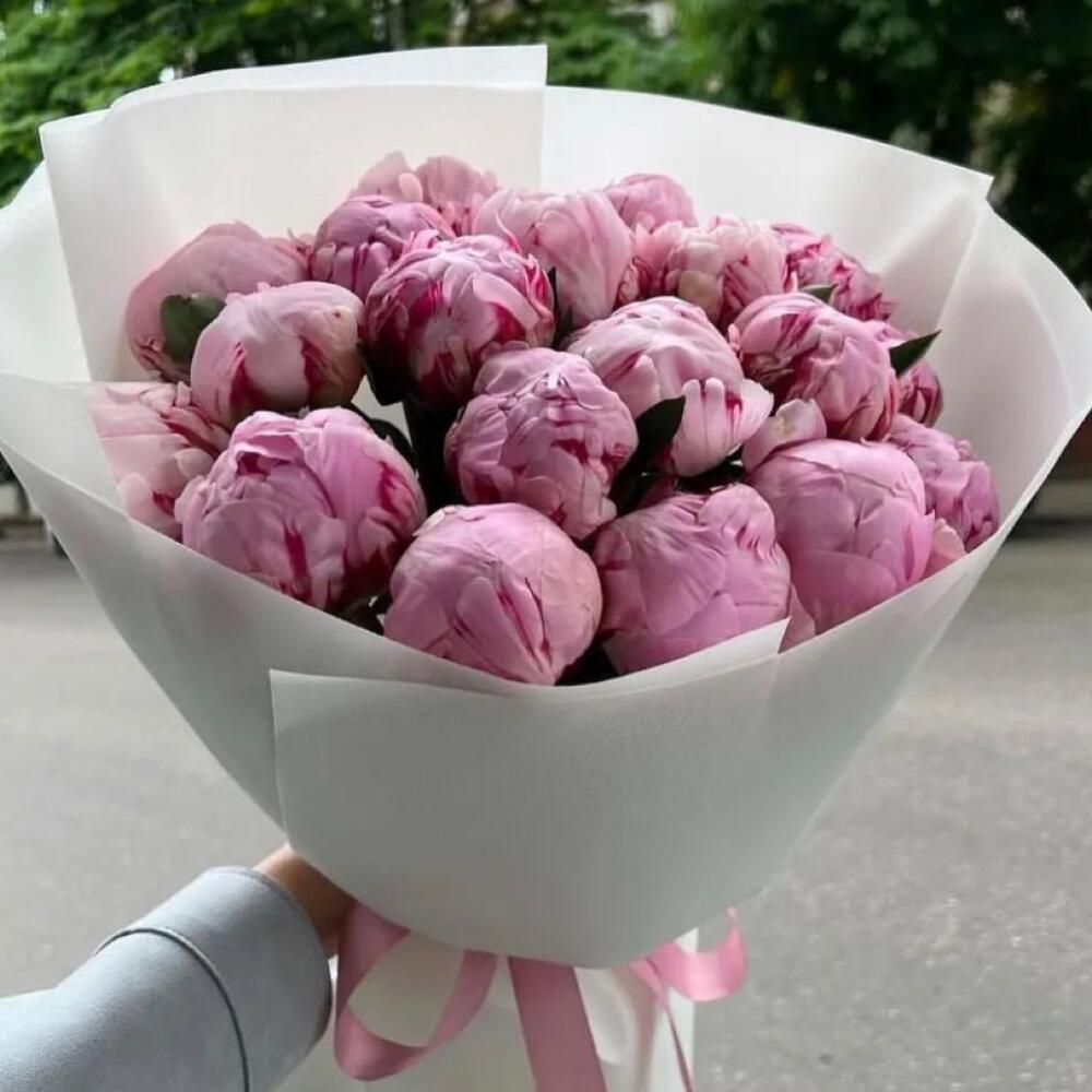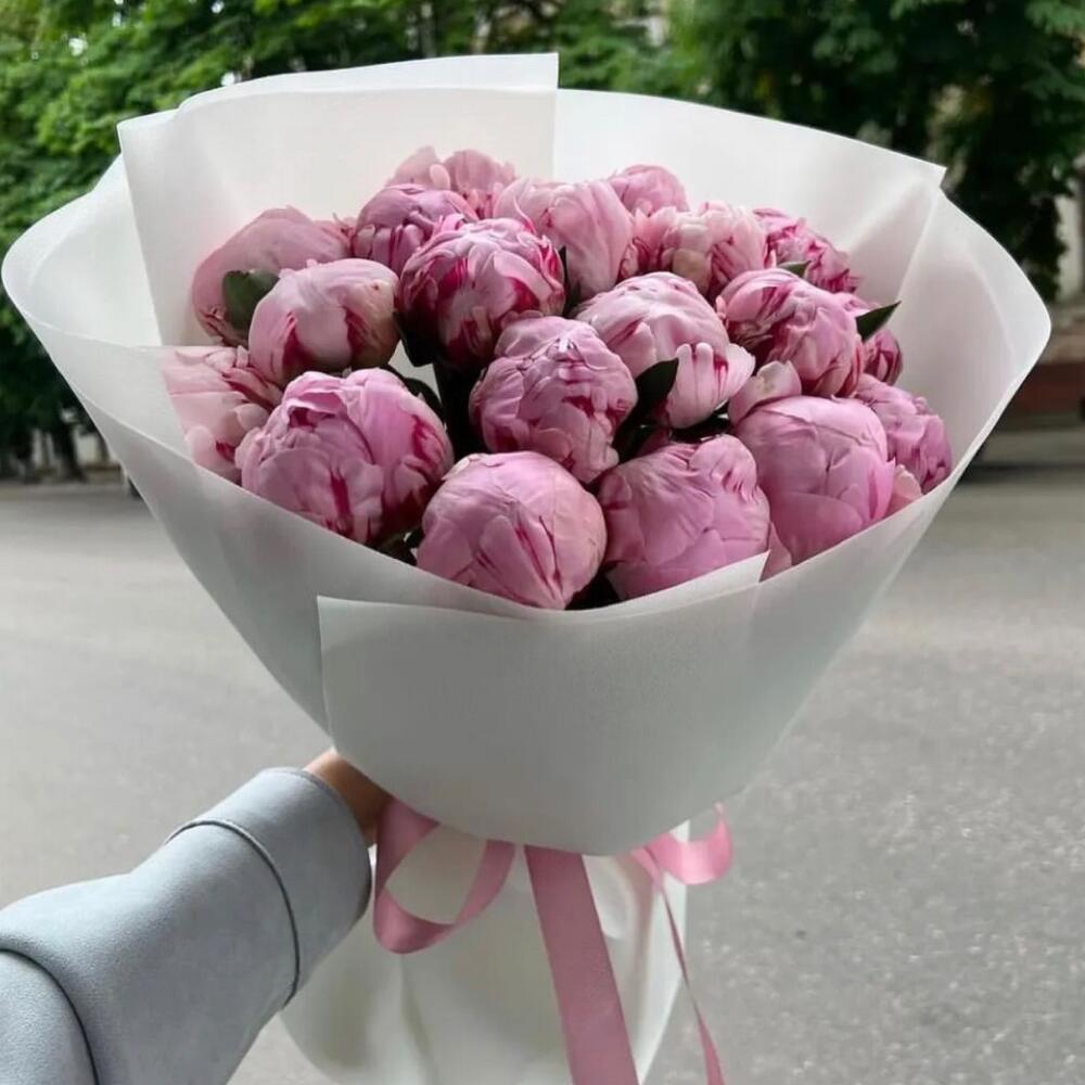 Лента атласная - 1 шт. Пион Сара Бернар - 19 шт. Упаковка дизайнерская - 4 шт.