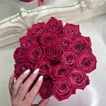 Лента атласная - 1 шт. Коробка шляпная - 1 шт. розы малиновые - 19 шт.