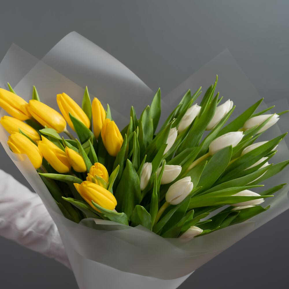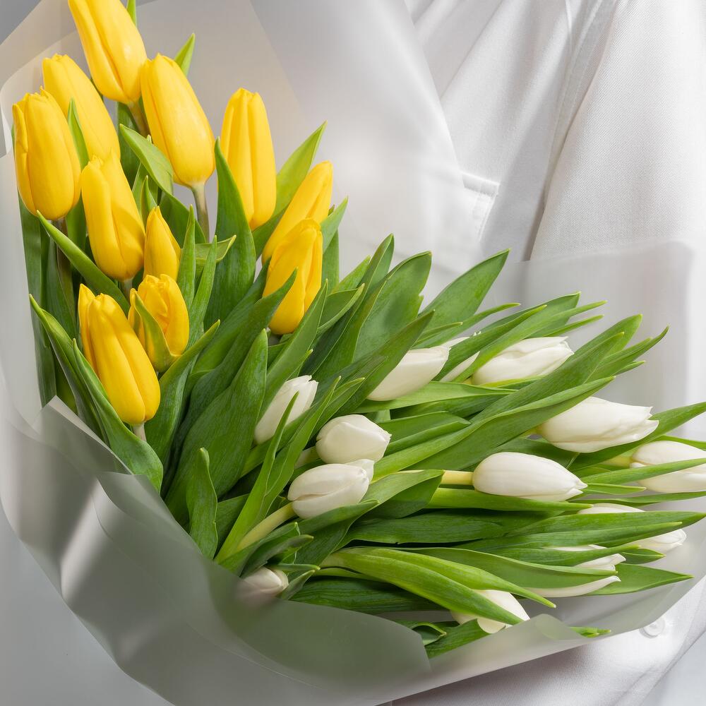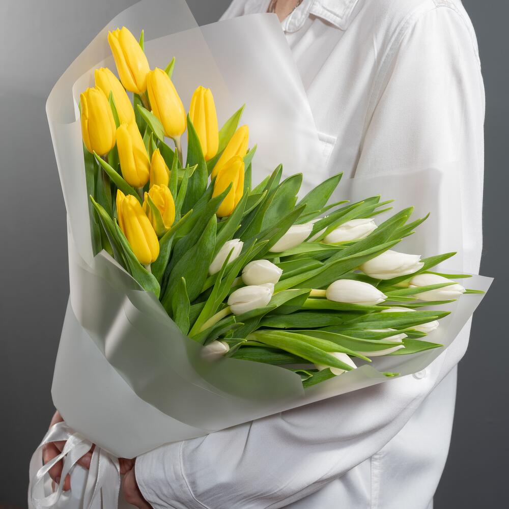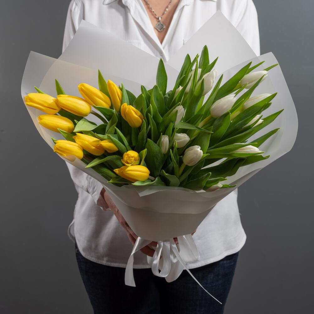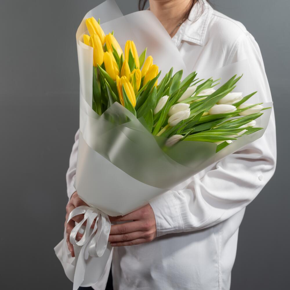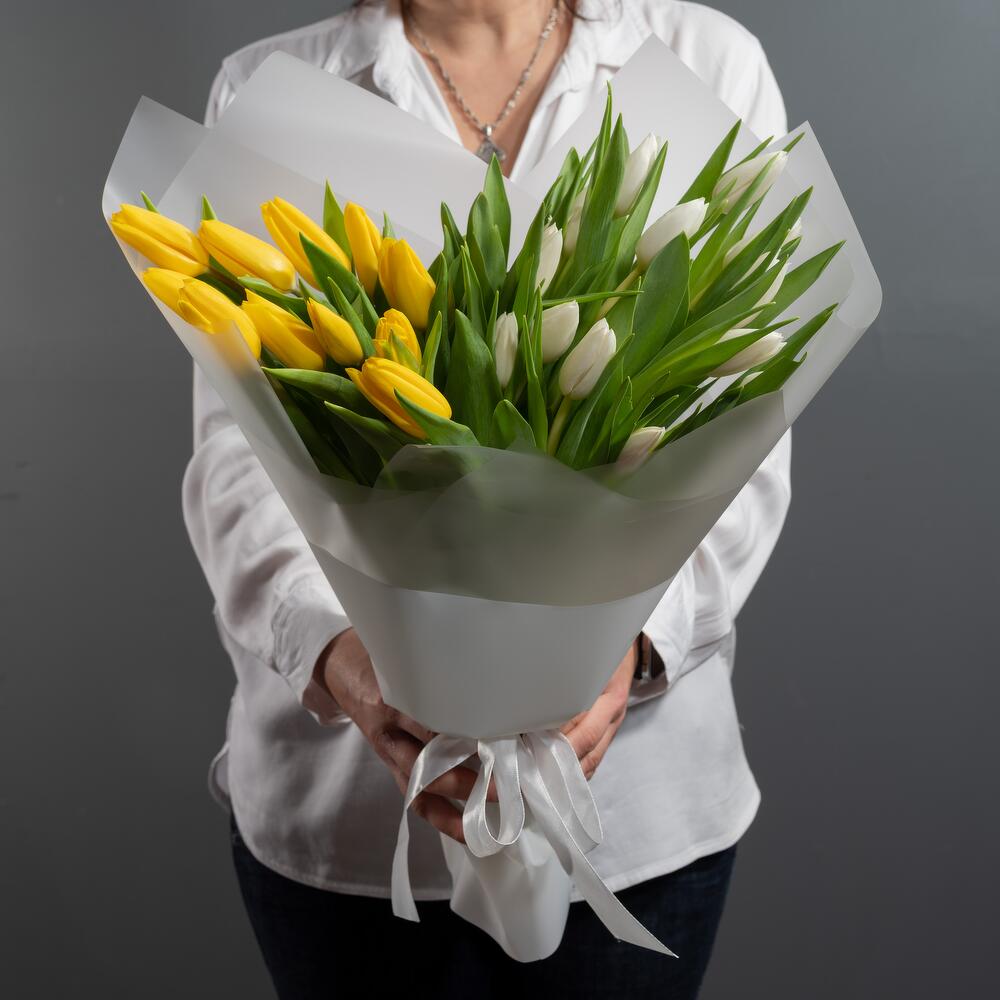 Атласная лента - 1 шт. Дизайнерская упаковка - 1 шт. белые и желтые тюльпаны - 25 шт.
