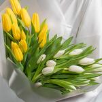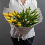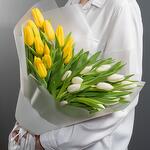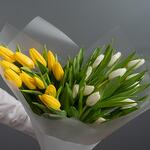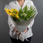 25 белых и желтых тюльпанов в дизайнерской упаковке