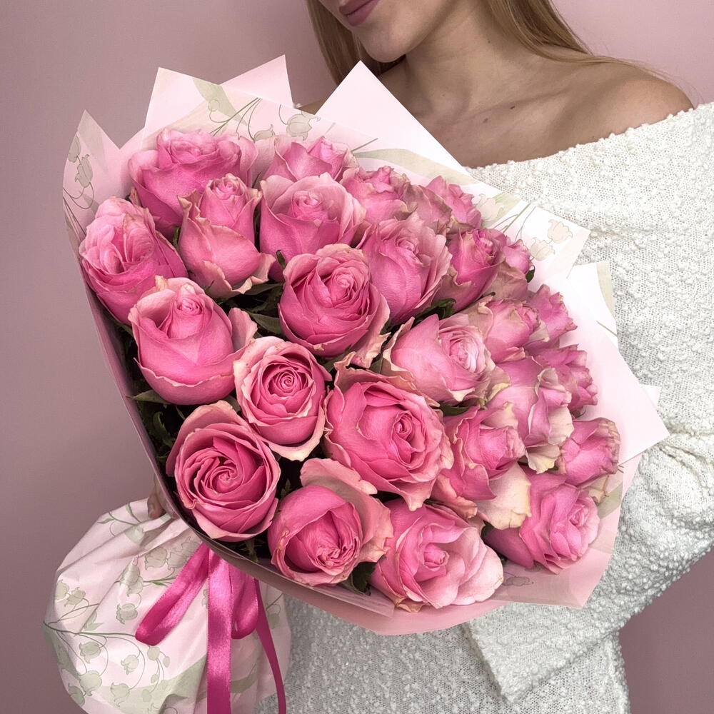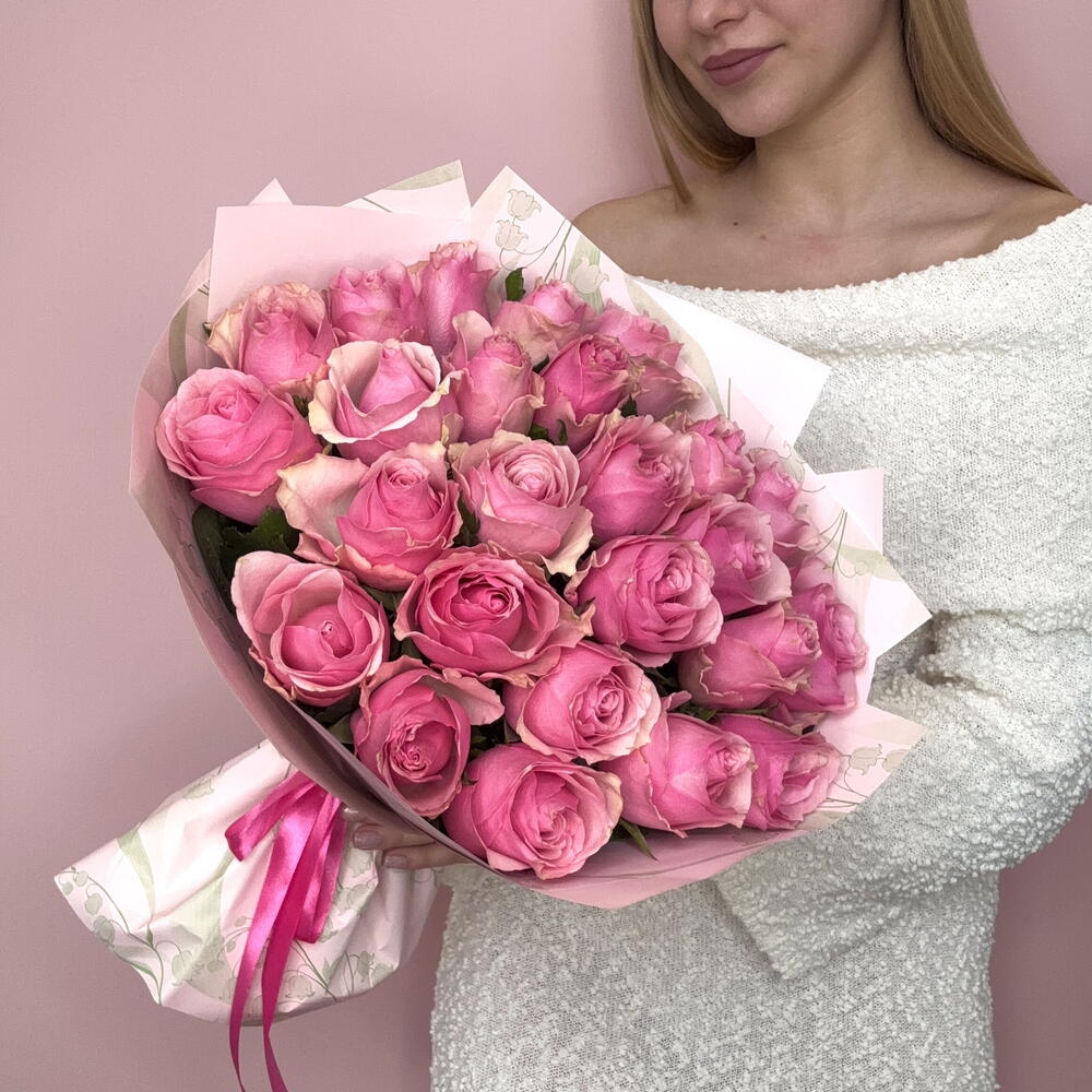25 розовых роз в упаковке
