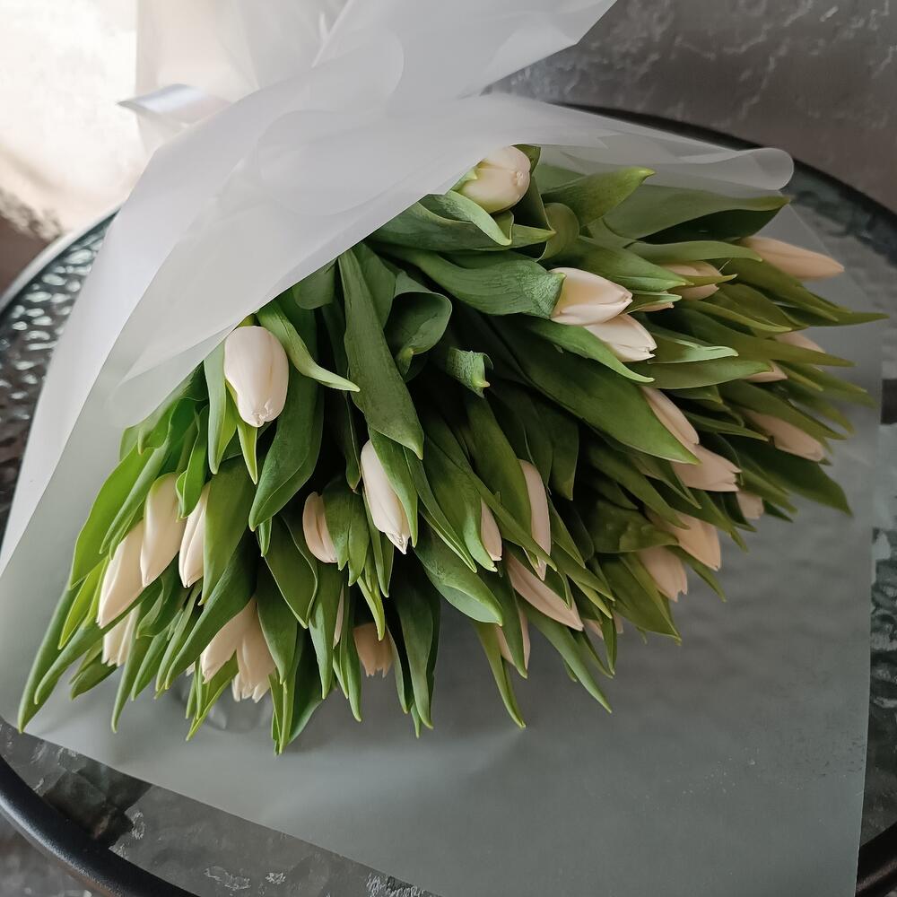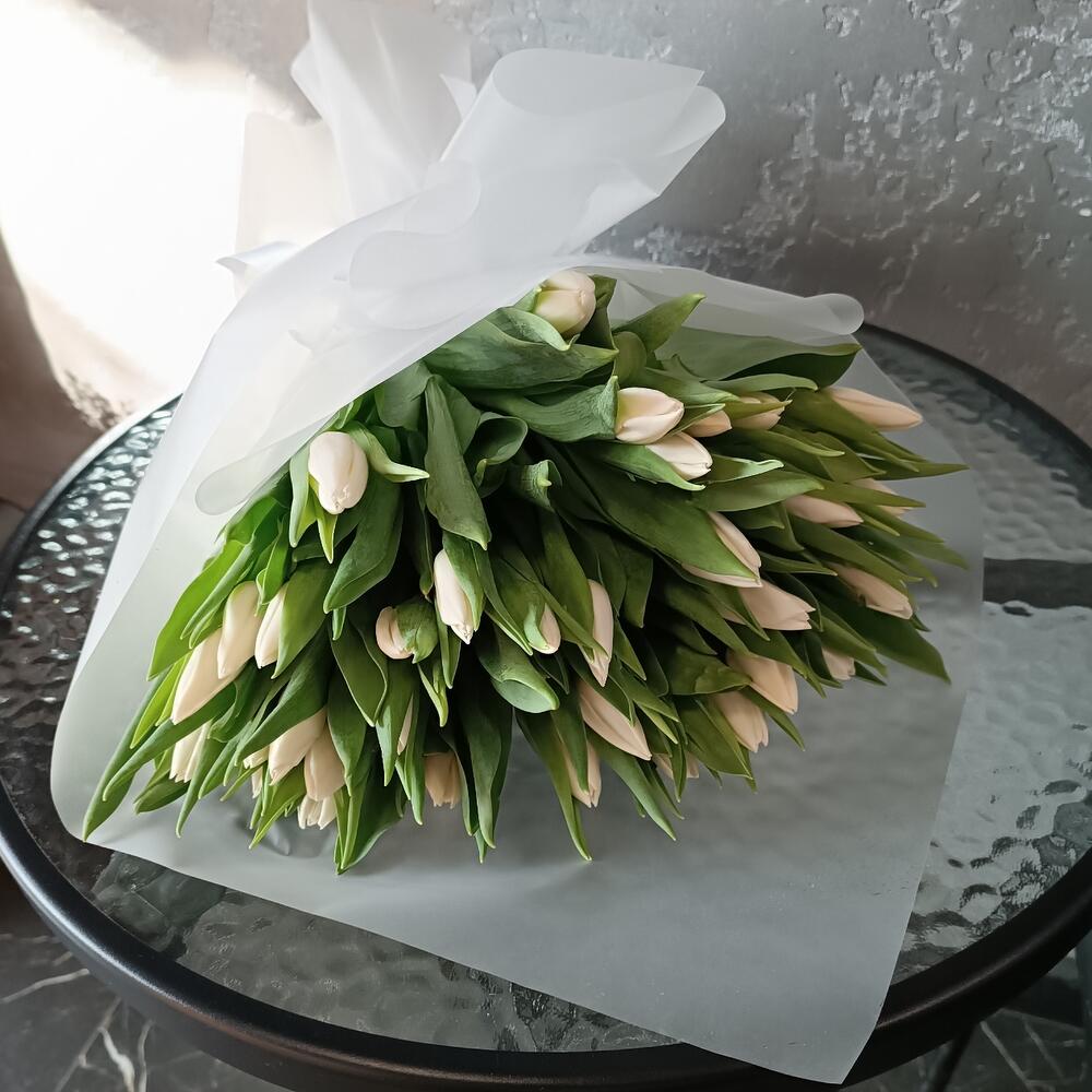 Тюльпан - 35 шт. Лента атласная - 1 шт. Дизайнерская упаковка - 1 шт.