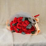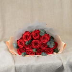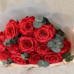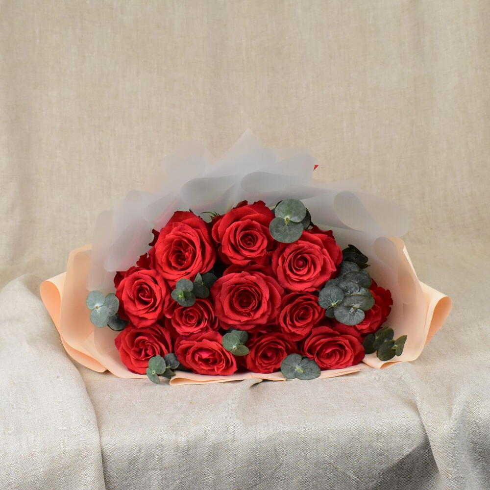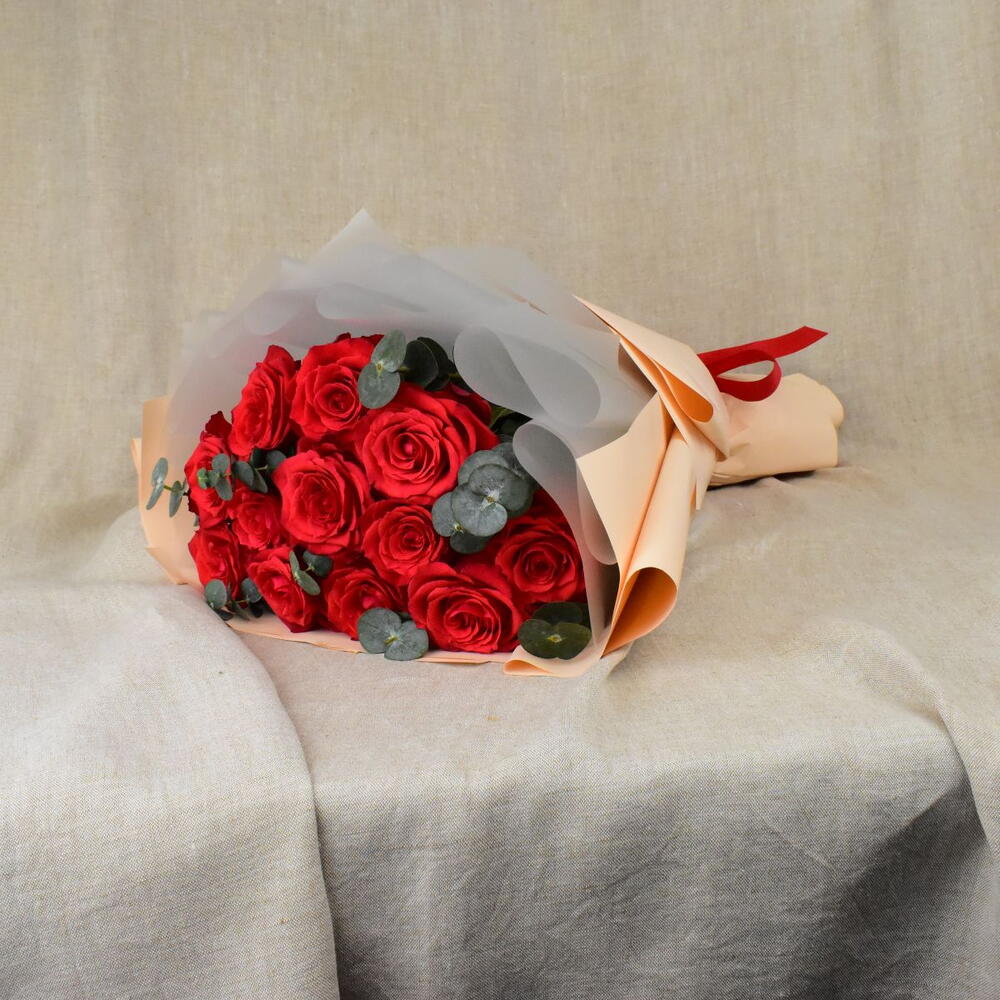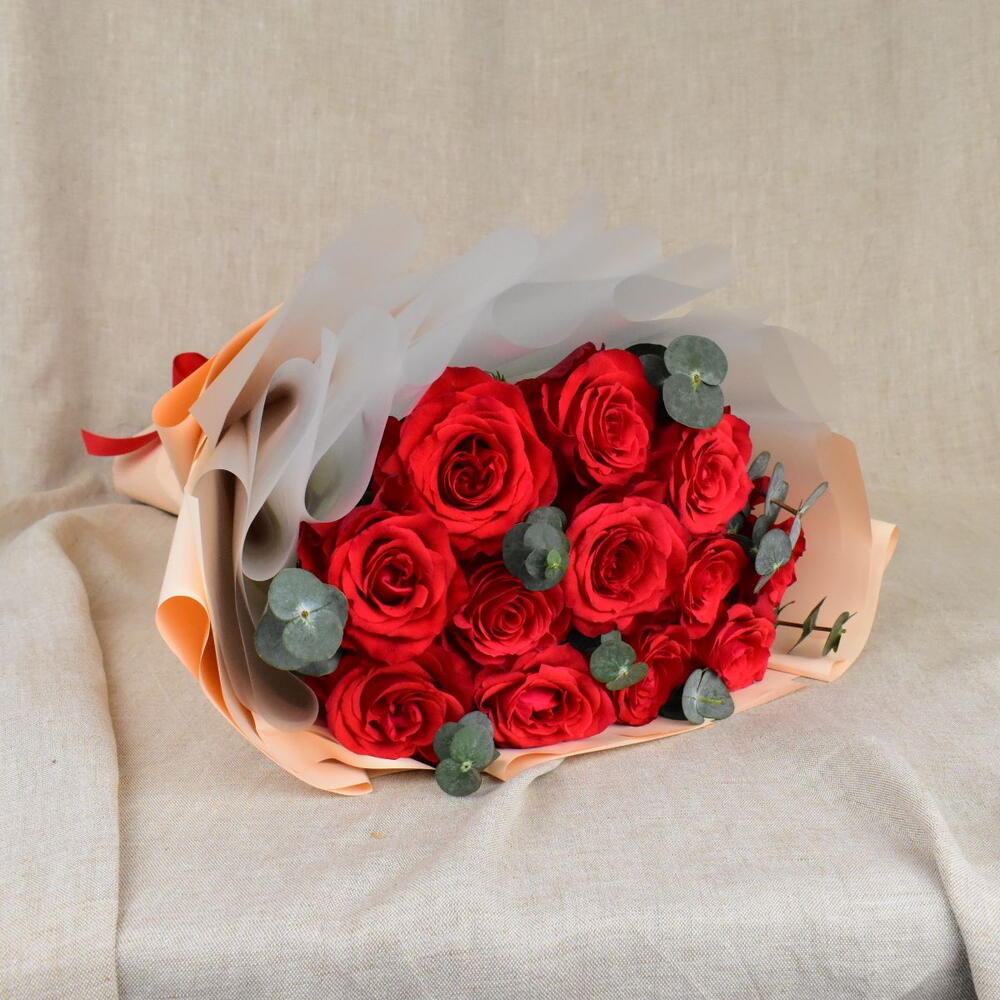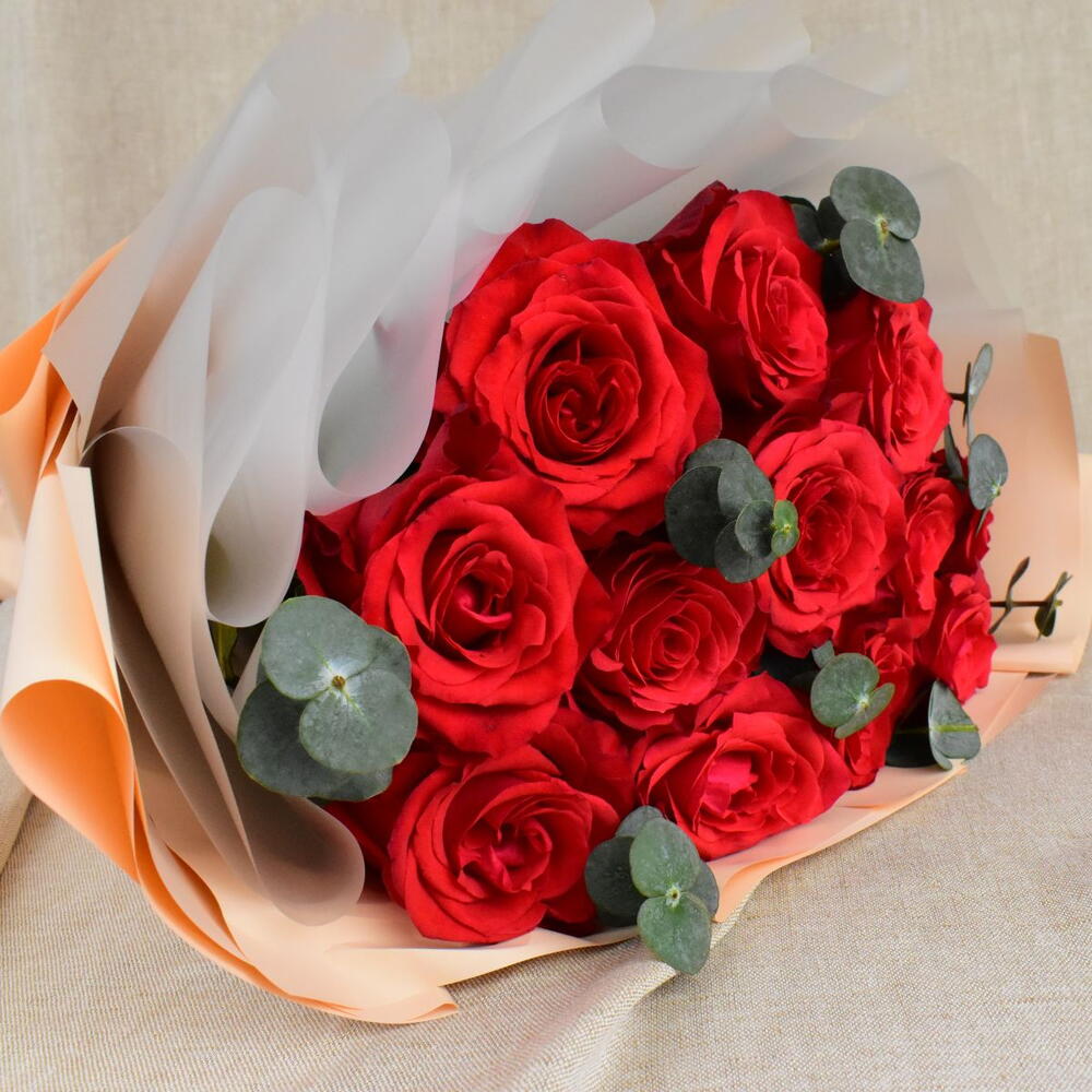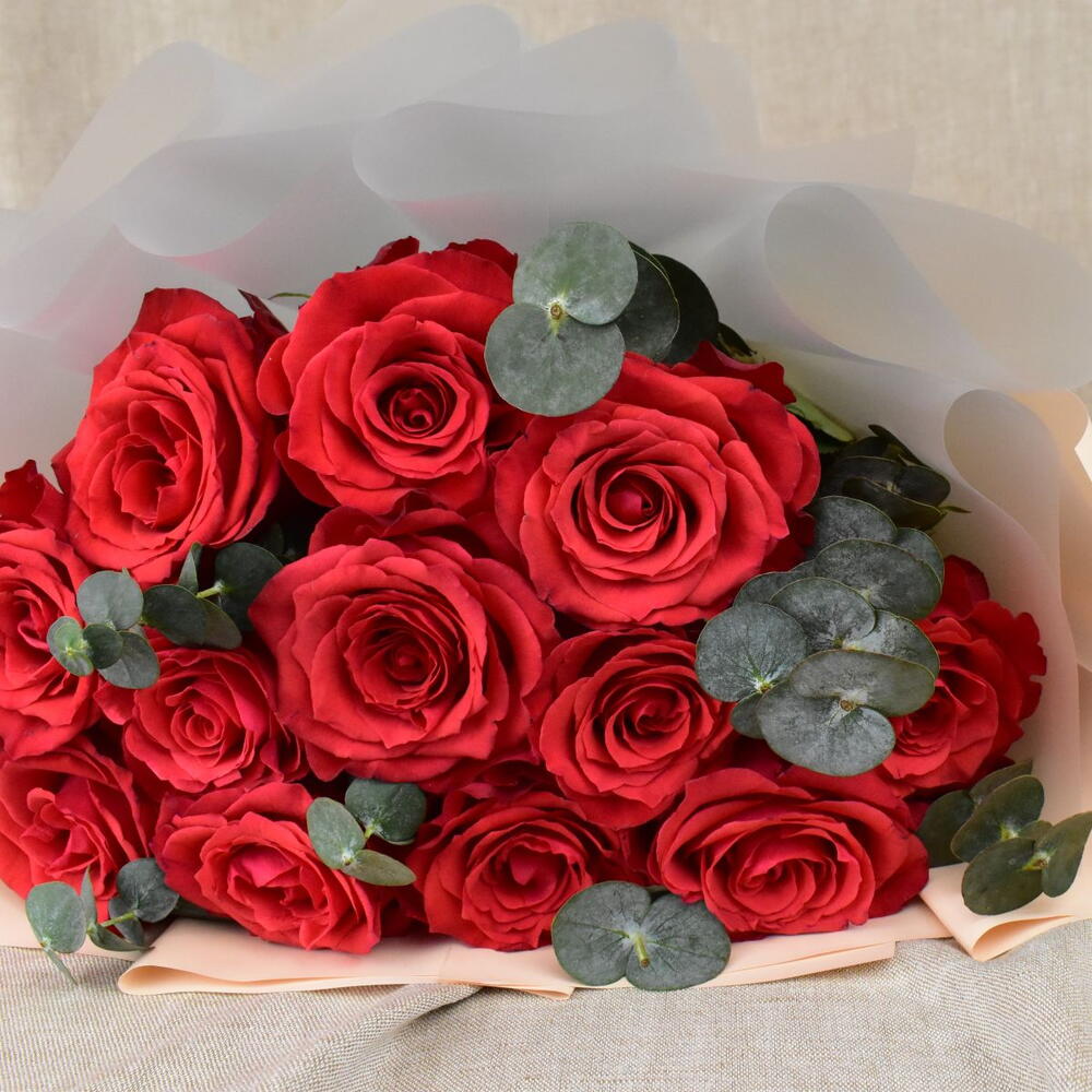 Эвкалипт - 4 шт. Лента атласная - 1 шт. Упаковка дизайнерская - 2 шт. роза альтамира 50 см - 11 шт.