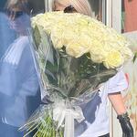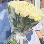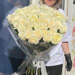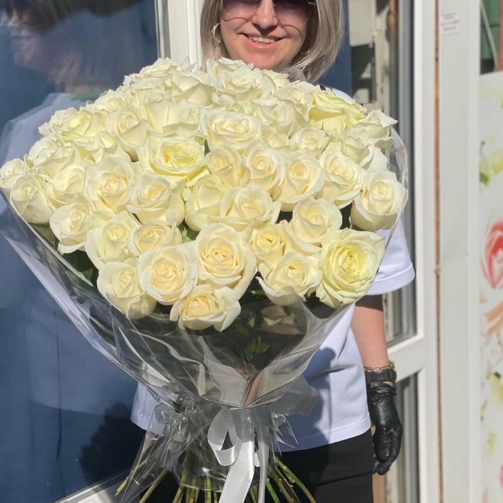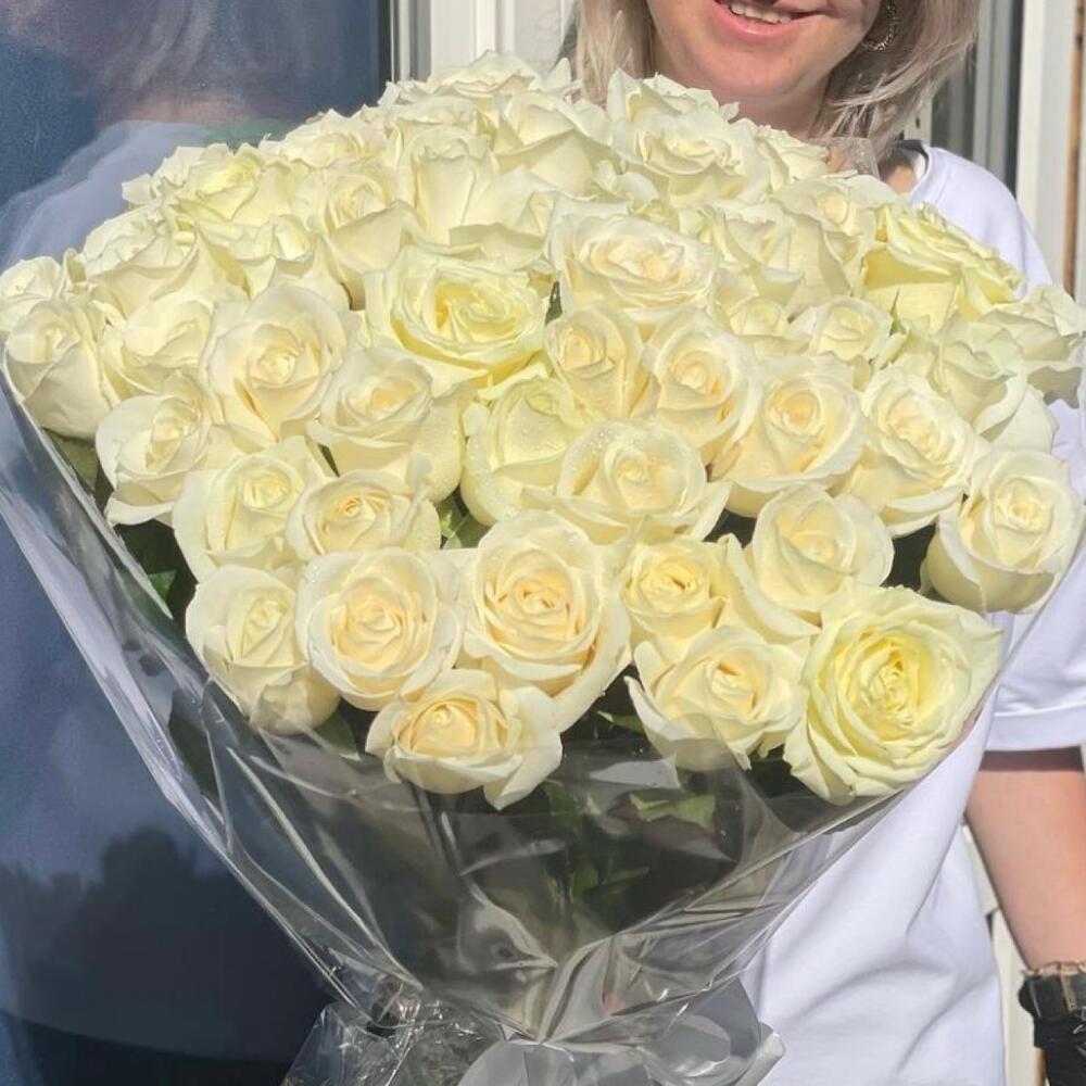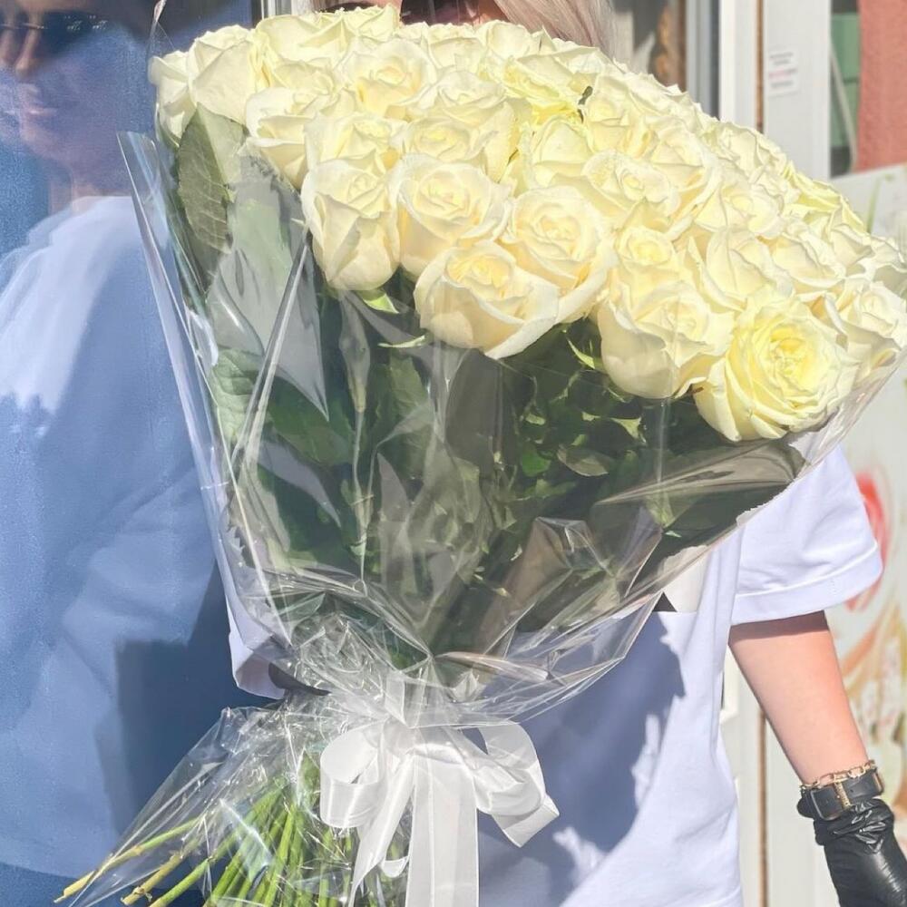 Лента атласная - 1 шт. Роза белая - 51 шт. Пленка матовая - 2 шт.
