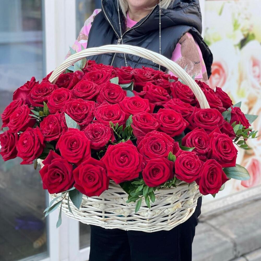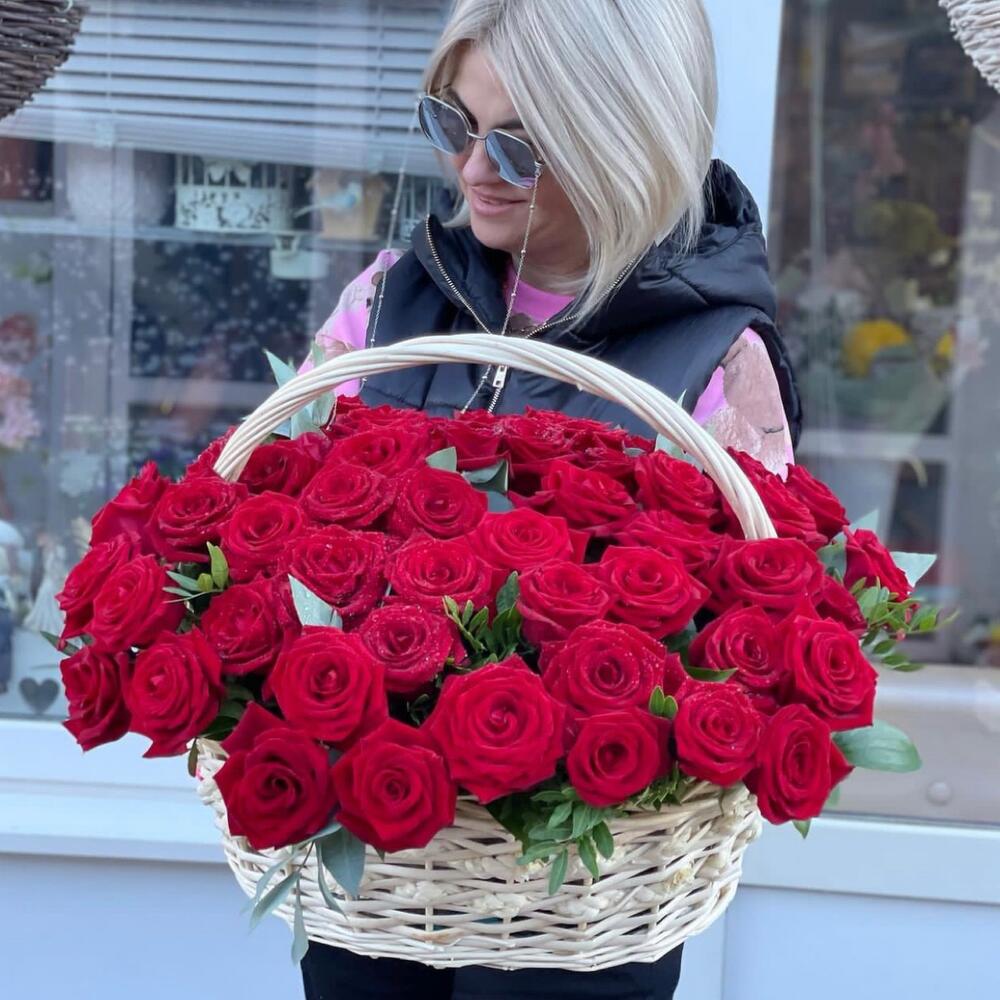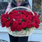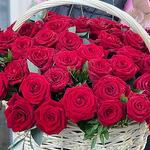 Роза красная - 51 шт. Зелень - 10 шт. Корзина плетеная - 1 шт. Оазис флористический - 4 шт.
