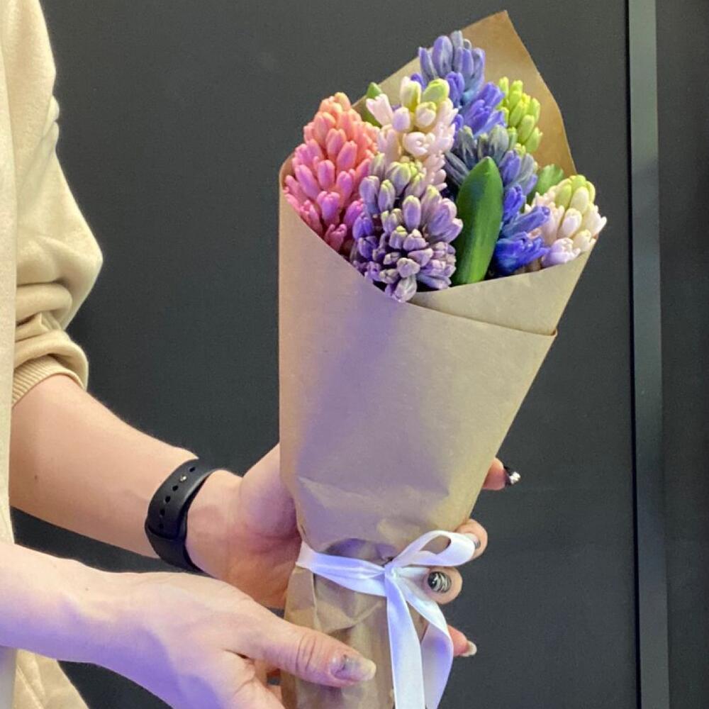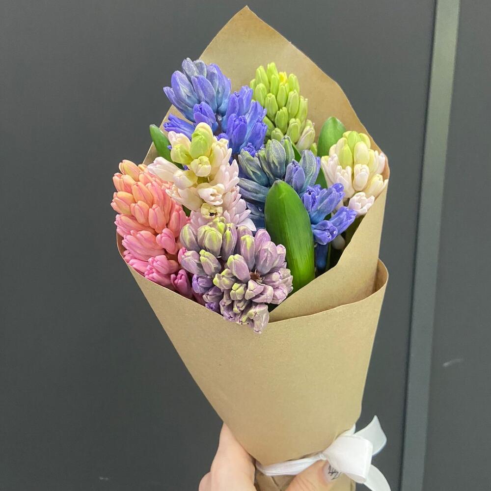 Гиацинт - 7 шт. Лента атласная - 1 шт. Крафт упаковка - 1 шт.