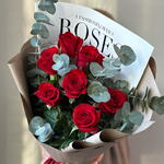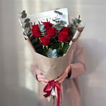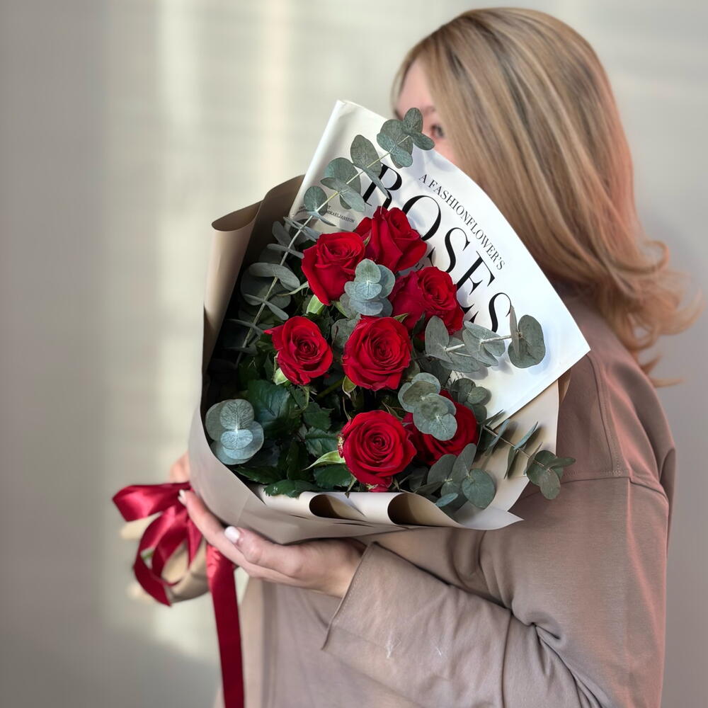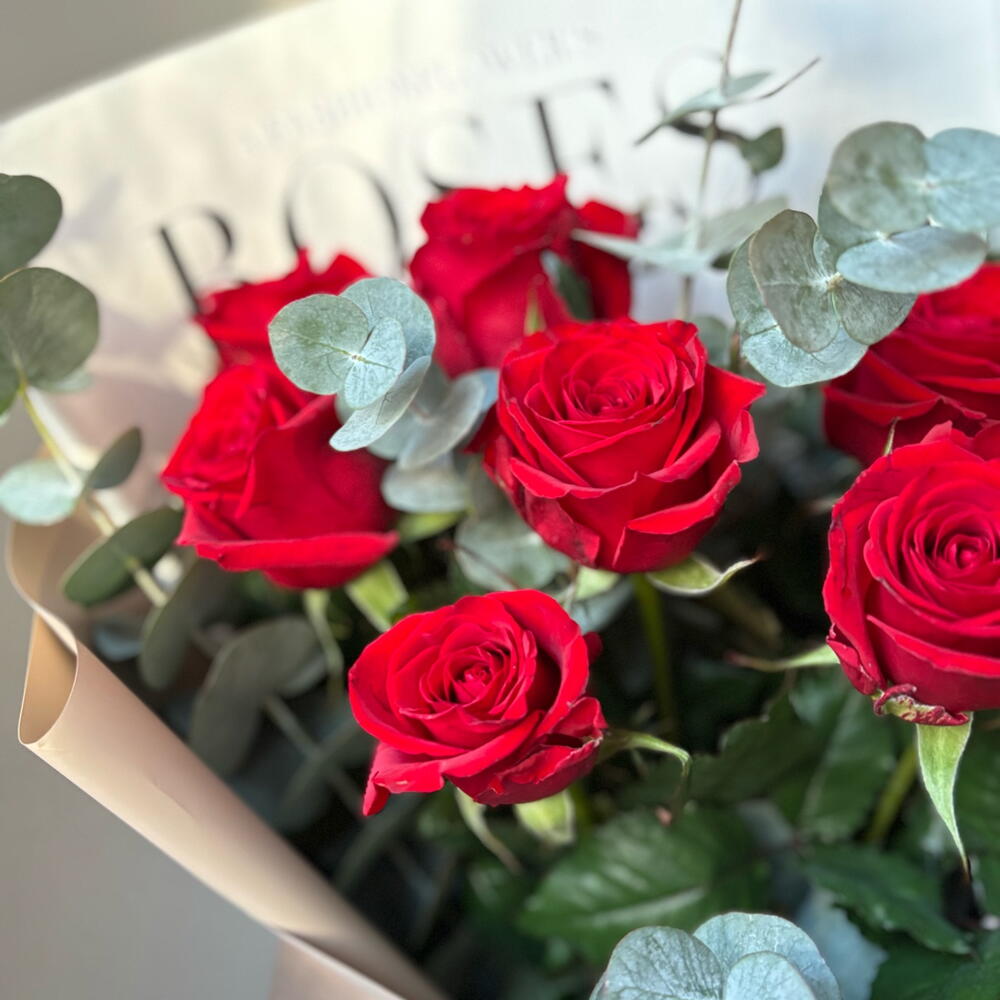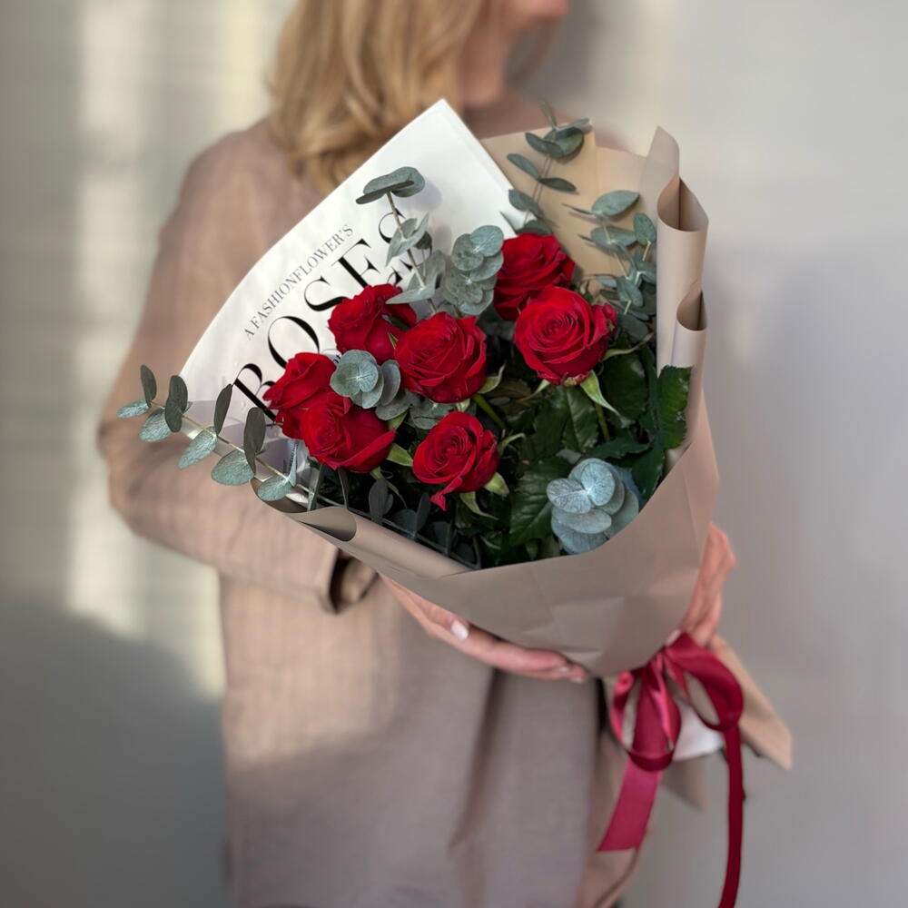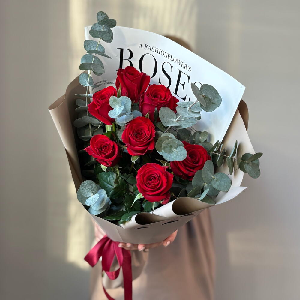 Букет из 7 красных роз с эвкалиптом