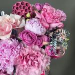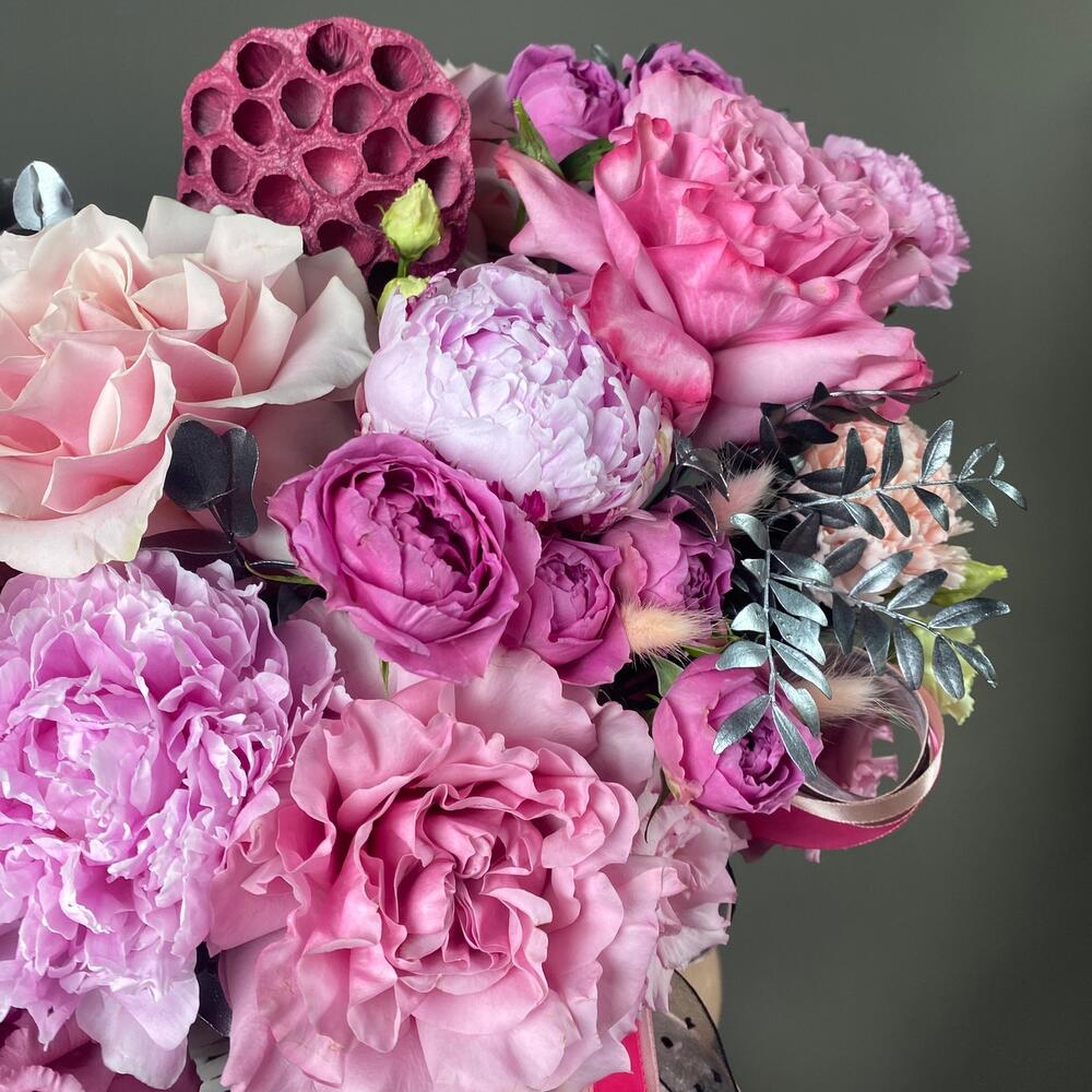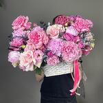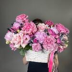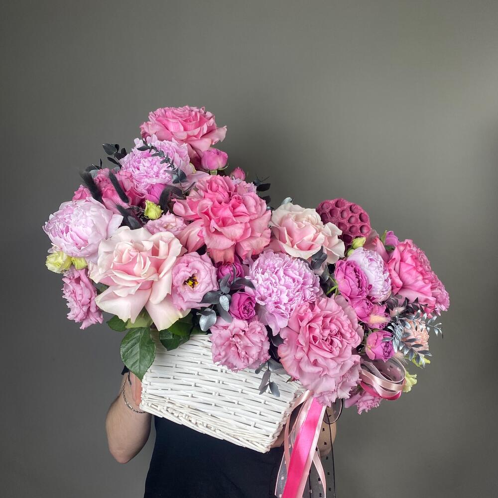 Корзина - 1 шт. Писташ - 3 шт. Эвкалипт - 11 шт. Диантус - 3 шт. Роза розовая - 6 шт. Роза пионовидная - 8 шт. Лагурус - 8 шт. Роза misty bubbles - 5 шт. Эустома алиса - 4 шт. коробочка лотоса - 1 шт. пион или пионовидная роза - 5 шт.