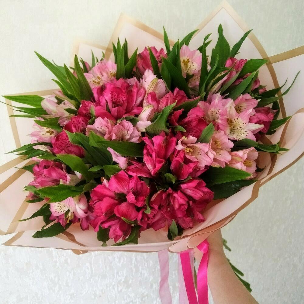 Экзотические цветы альстромерии, похожие на порхающих бабочек, отличаются стойкостью и разнообразием расцветок. В данном букете используются малиновые и нежно-розовые цветы. На каждом стебле расположены несколько цветков-колокольчиков.