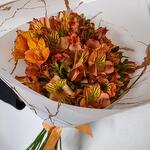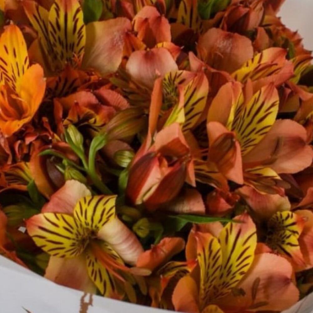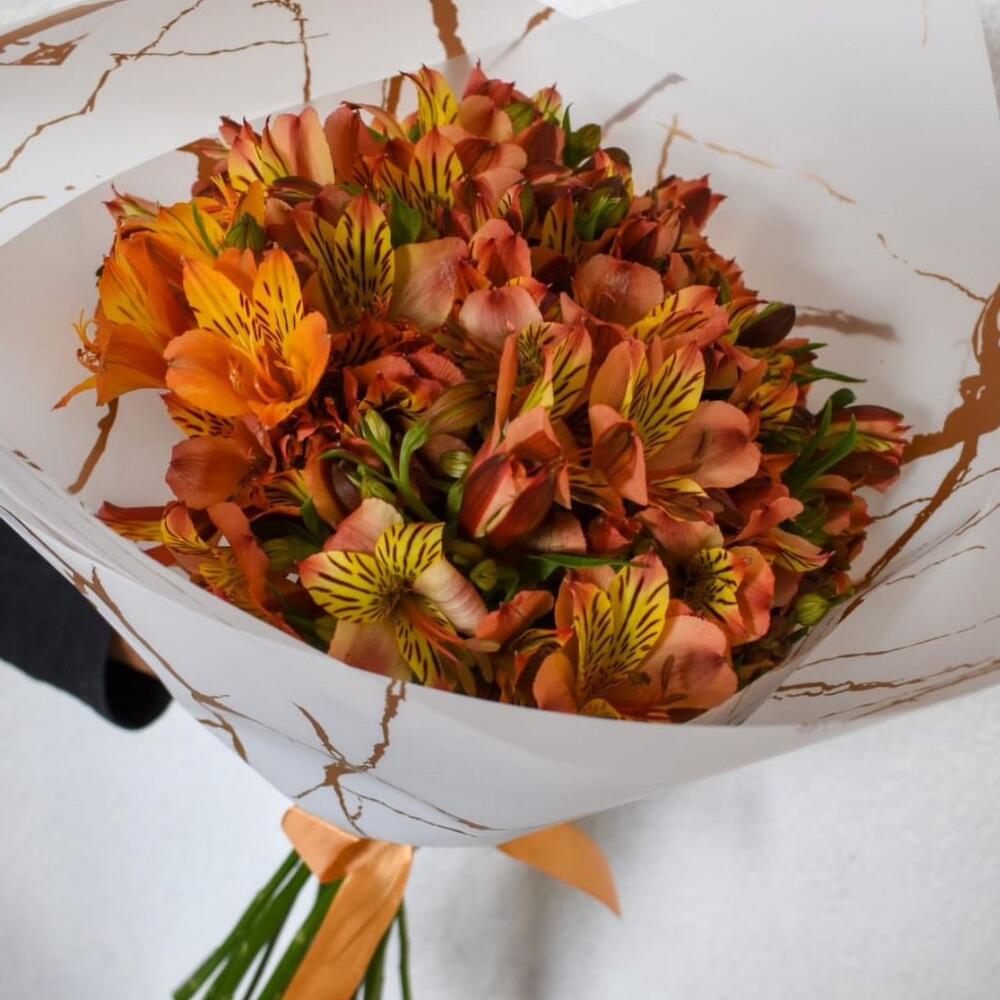 Лента атласная - 1 шт. Упаковка дизайнерская - 1 шт. Открыточка с вашими пожеланиями - 1 шт. отличное настроение от флориста - 100 шт. альстромерияохра - 13 шт.