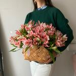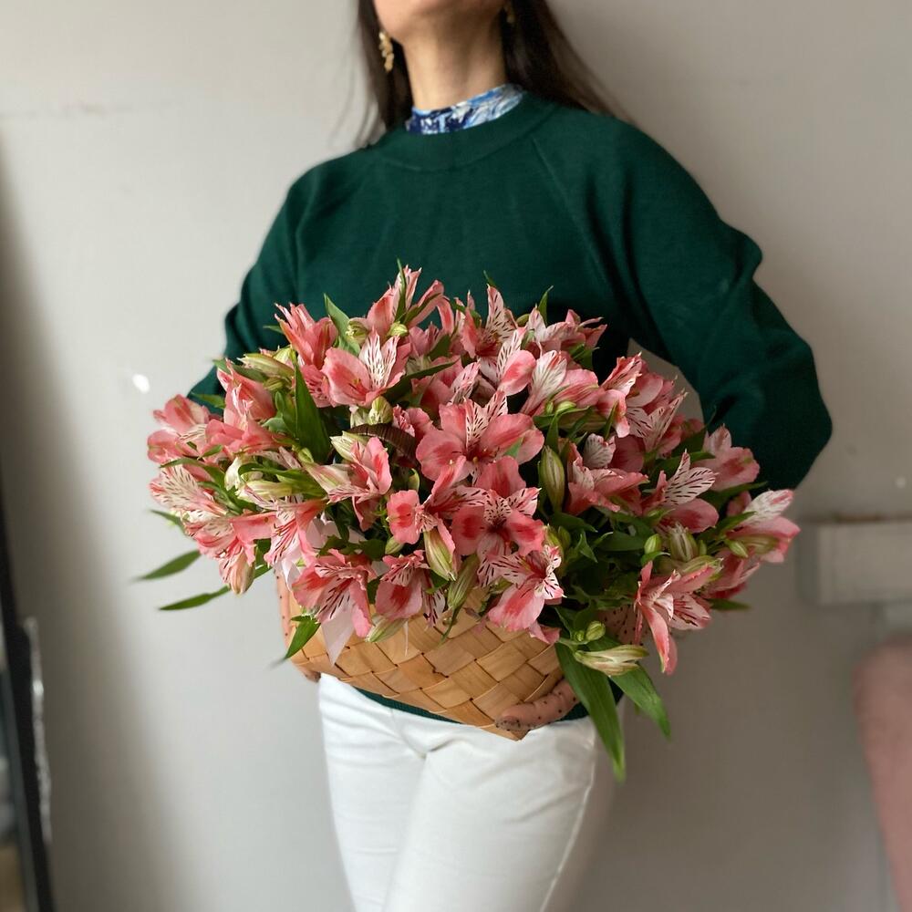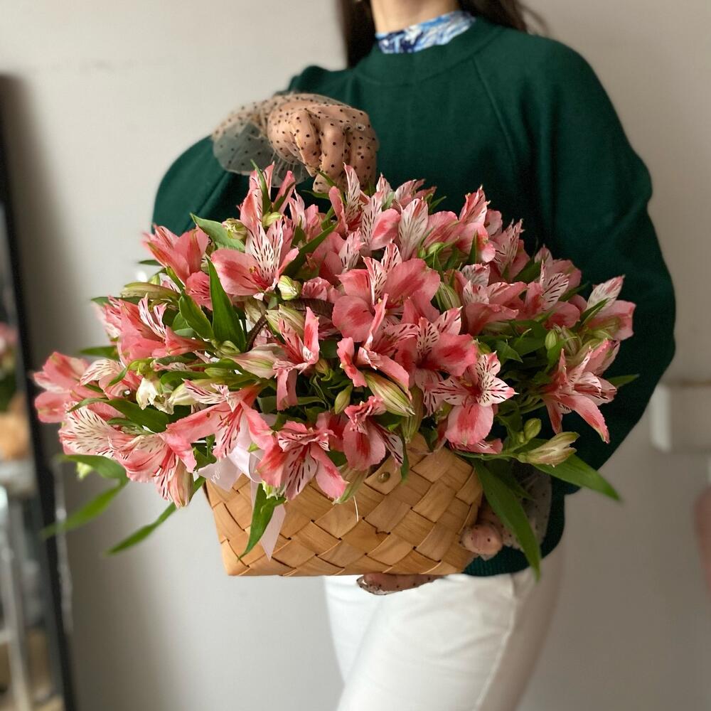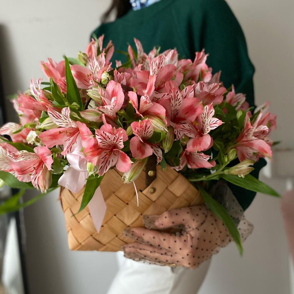 Лента атласная - 1 шт. Оазис флористический - 1 шт. сумка плетеная - 1 шт. альстромерии - 9 шт.