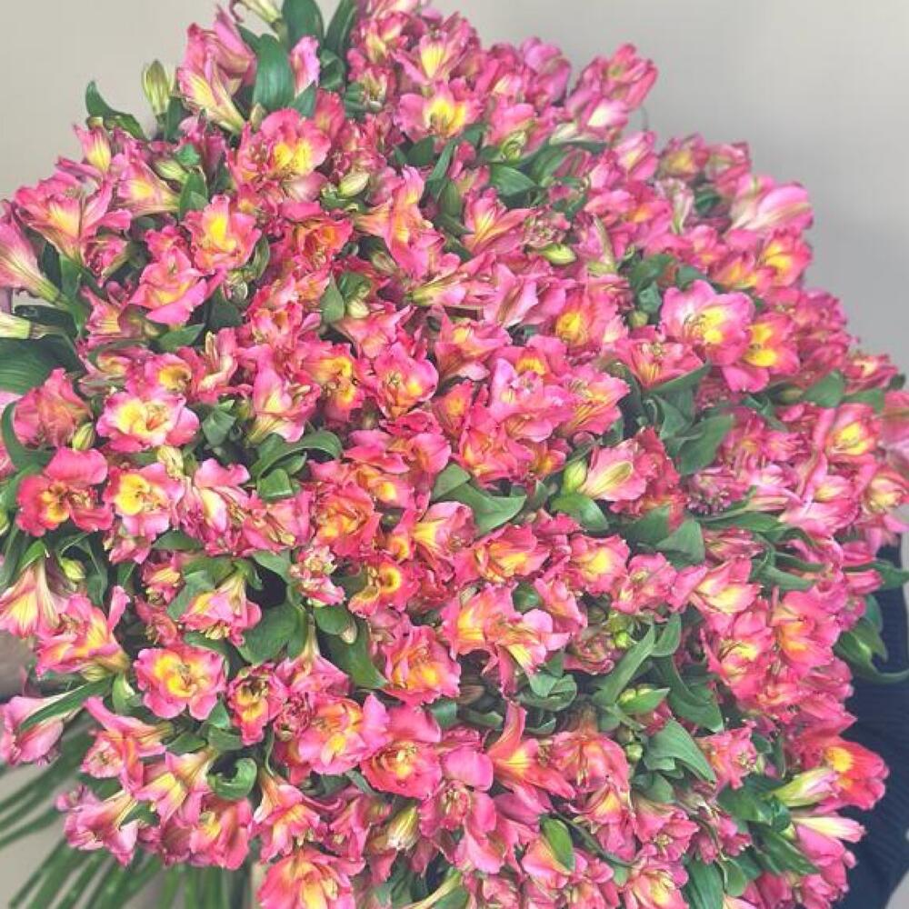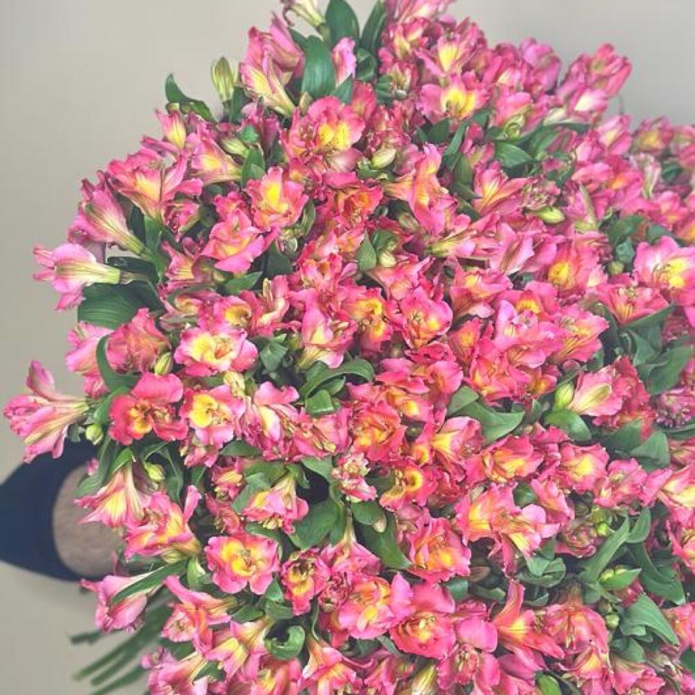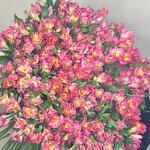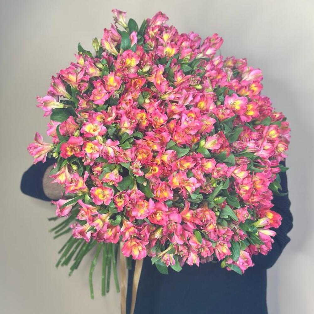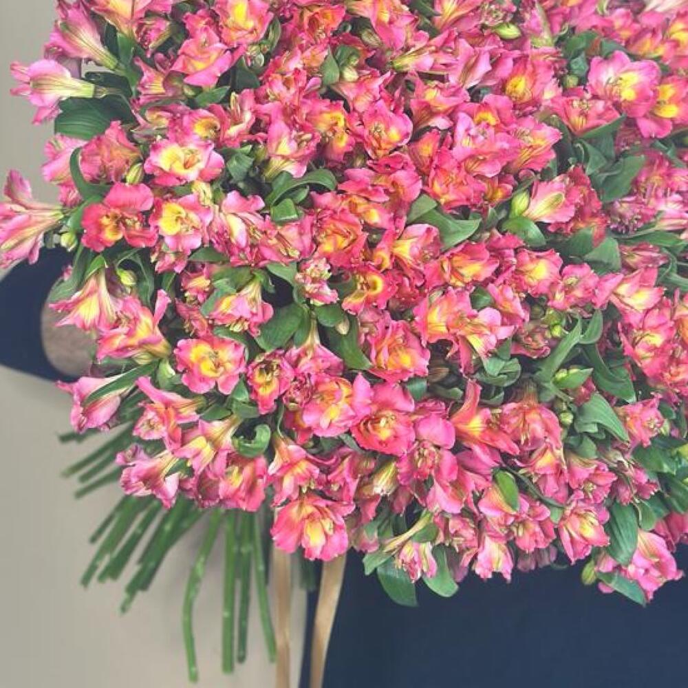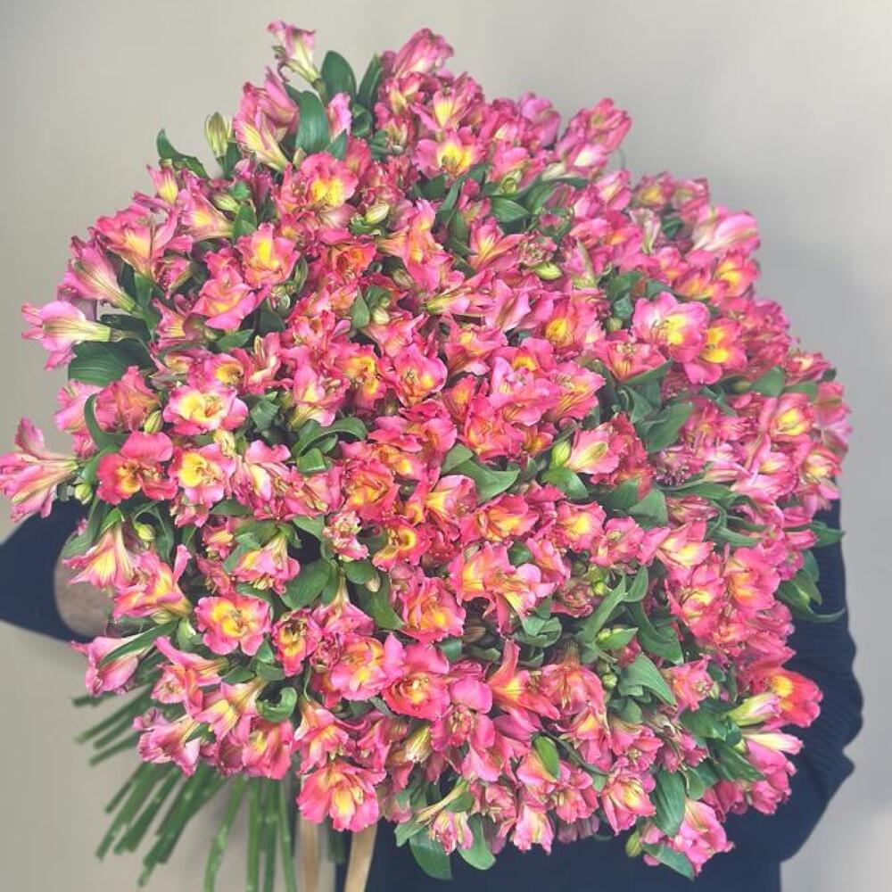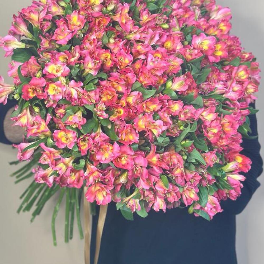 Альстромерия - 59 шт. Лента атласная - 1 шт. Открытка - 1 шт. Дизайнерская упаковка - 1 шт. аквабокс с водой - 1 шт.