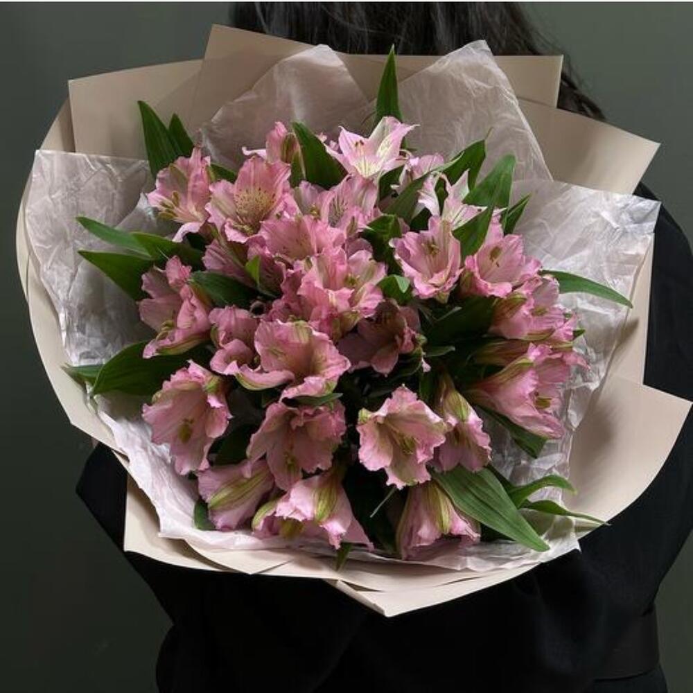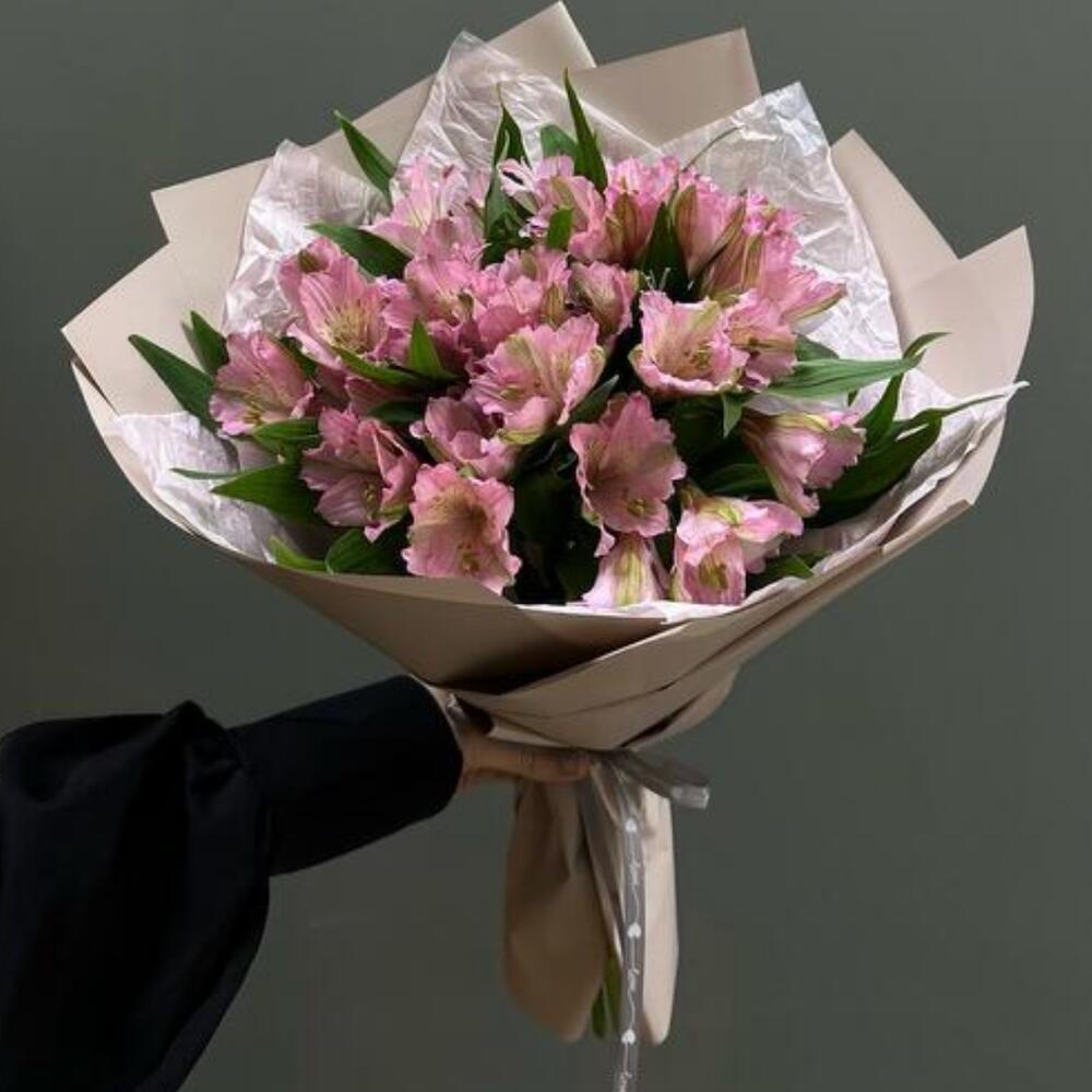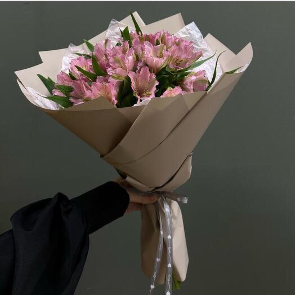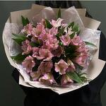 Лента атласная - 1 шт. бумага дизайнерская - 2 шт. альстромерия микс европа - 7 шт.