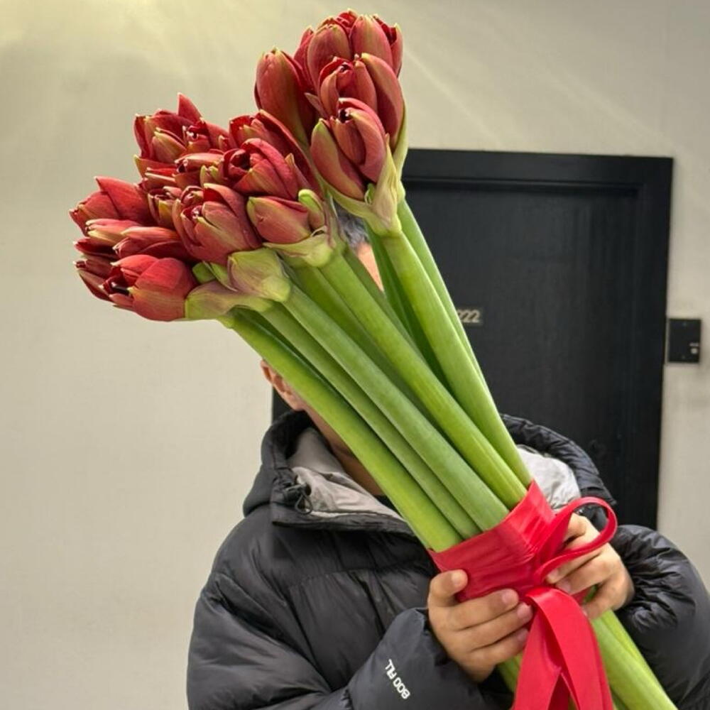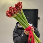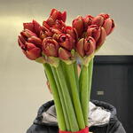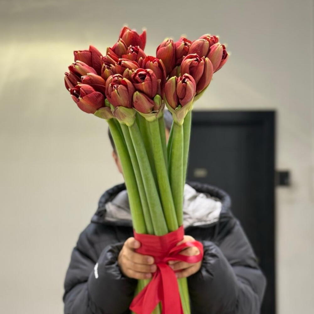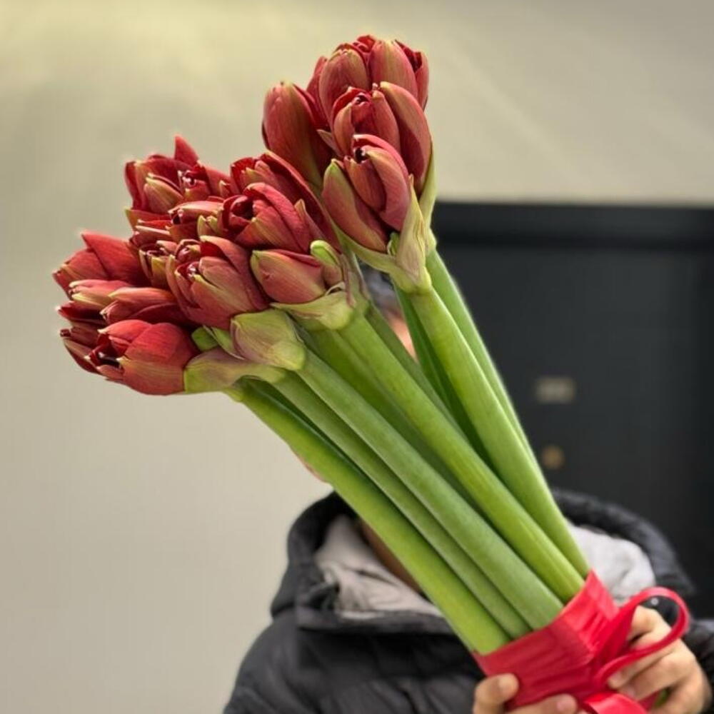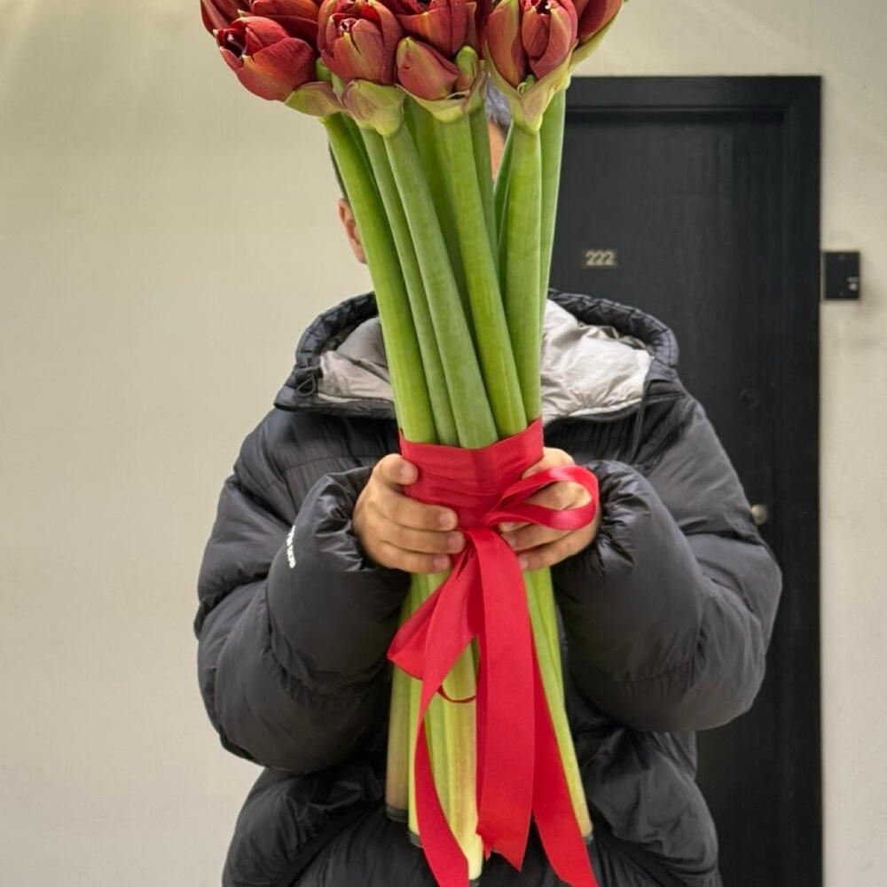 Лента атласная - 1 шт. Дизайнерское оформление - 1 шт. амариллисы красные - 15 шт. букетная записка - 1 шт.