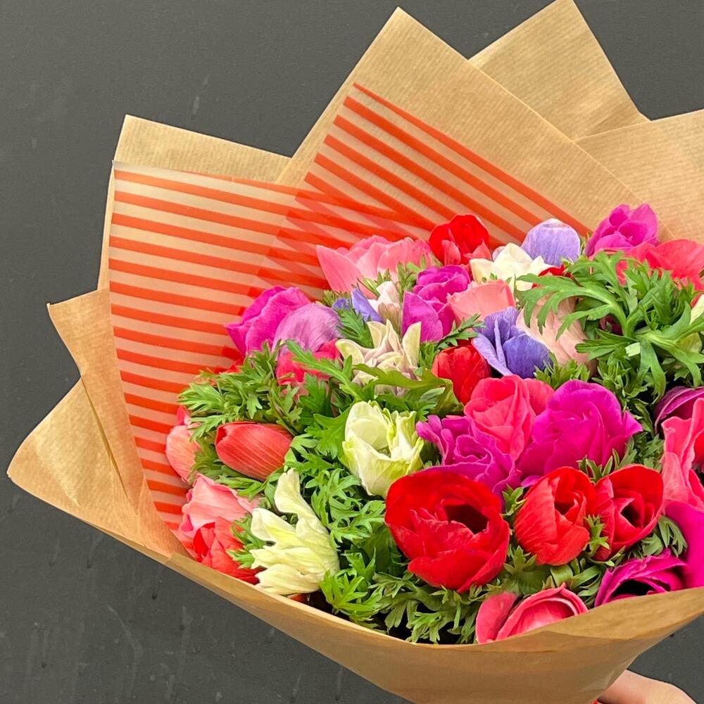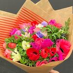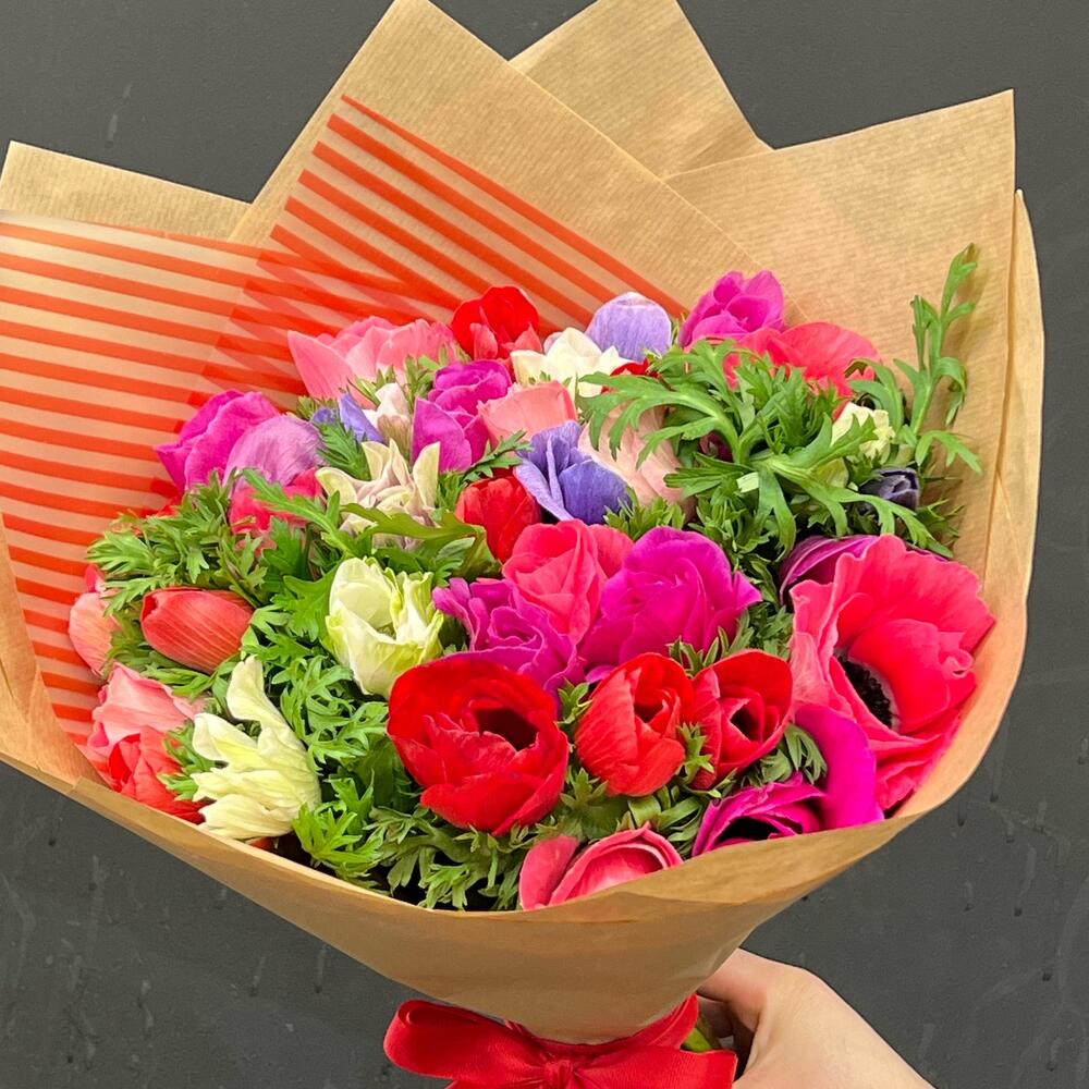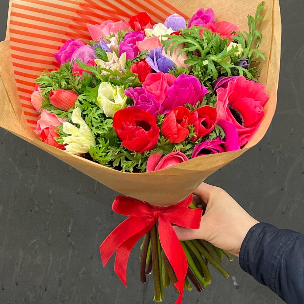 Лента атласная - 1 шт. Открытка - 1 шт. Дизайнерская упаковка - 1 шт. анемоны микс - 49 шт. аквабокс с водой - 1 шт.