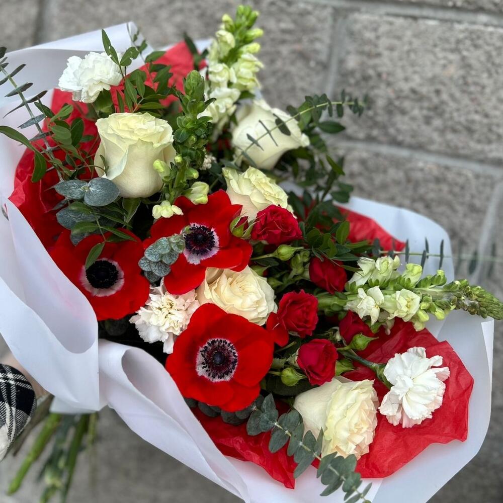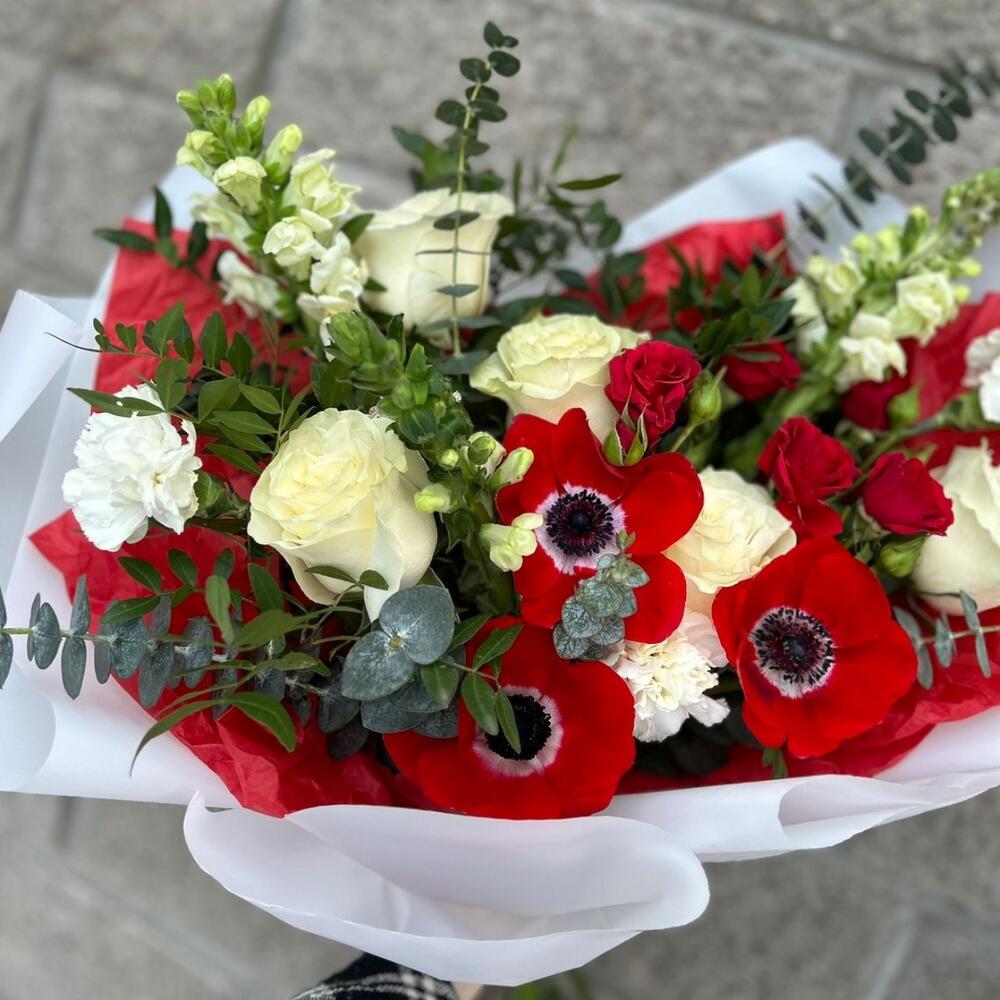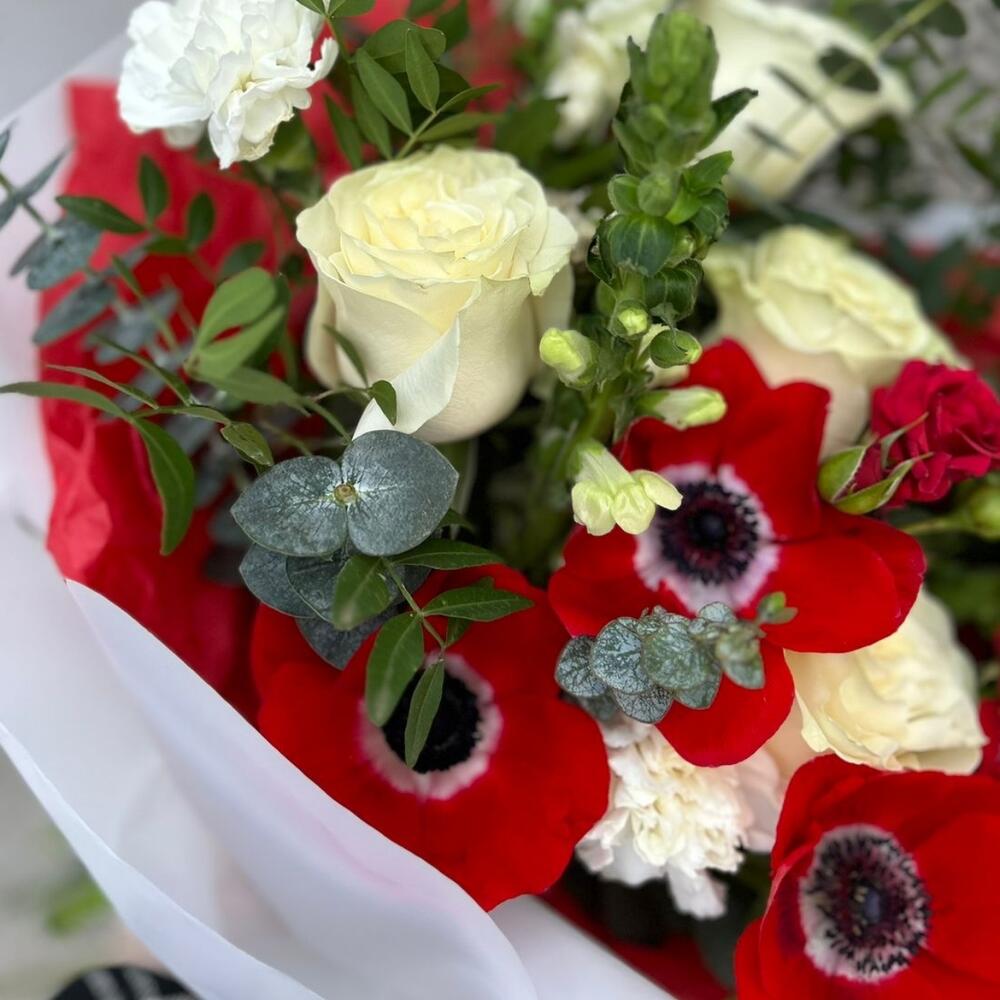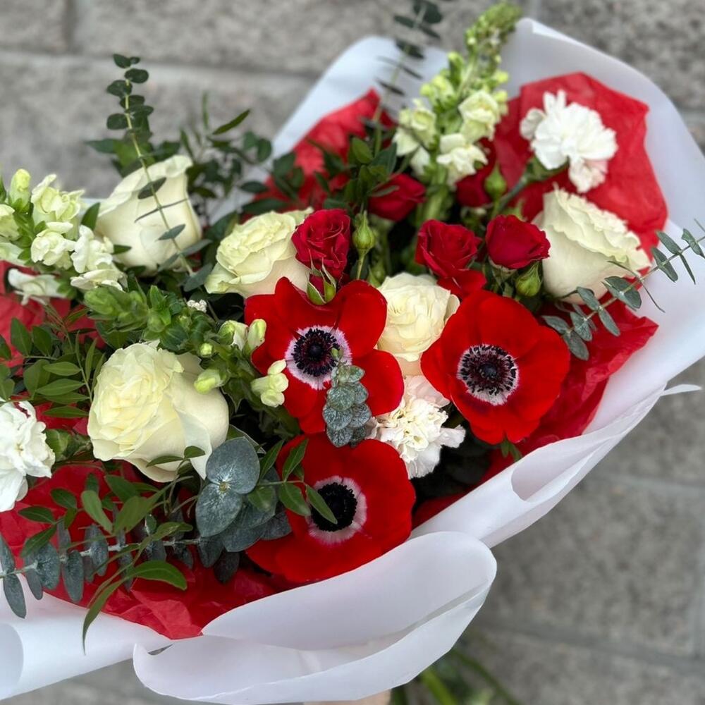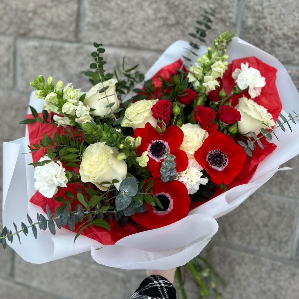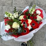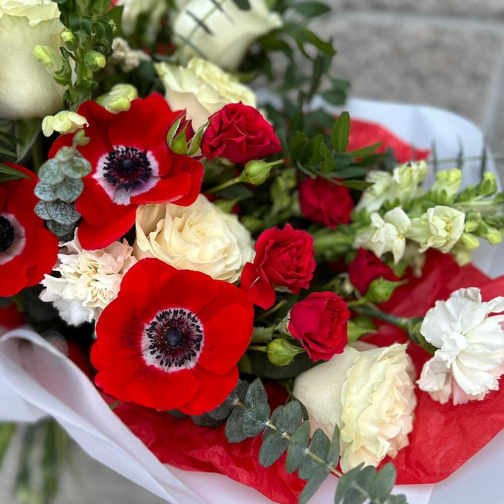 Анемоны, розы , красный букет 14 февраля