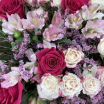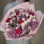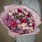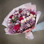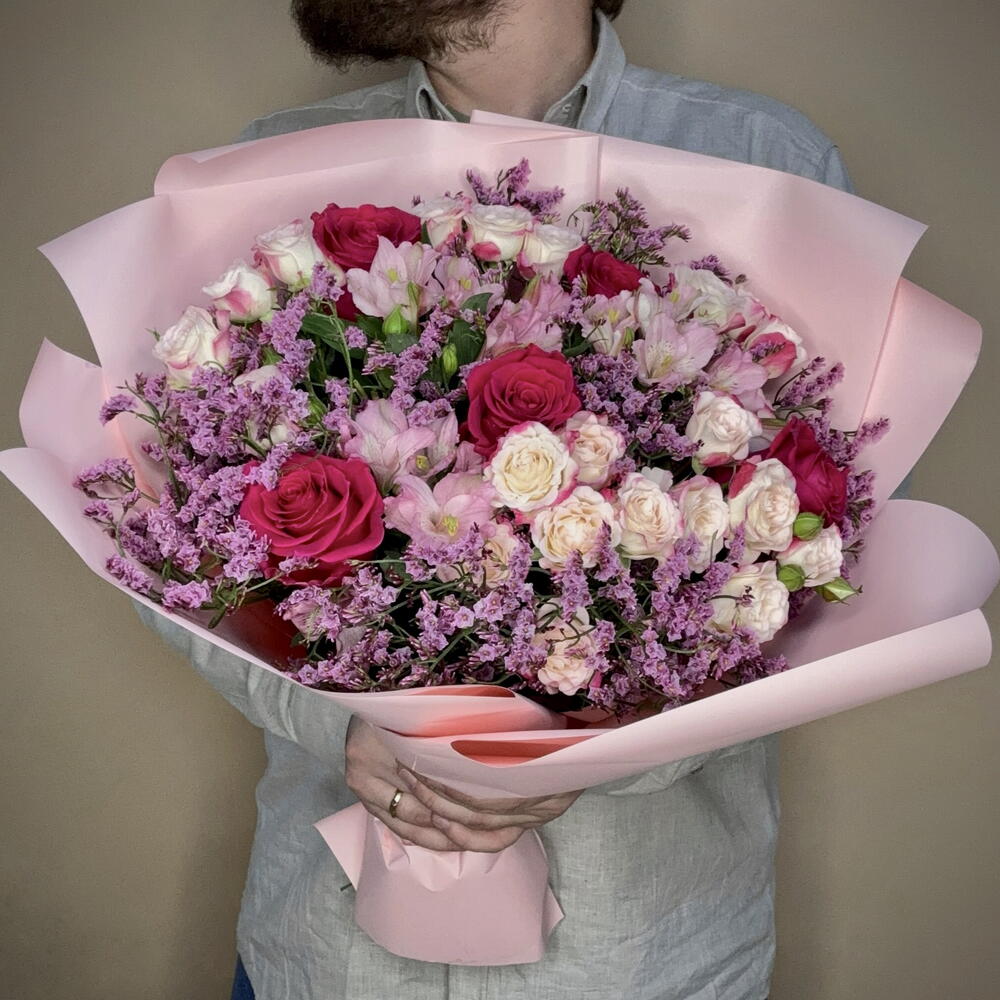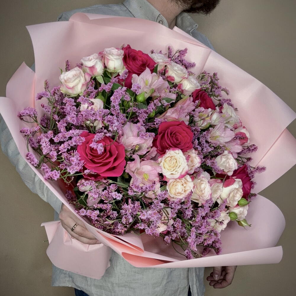 Альстромерия - 3 шт. Лимониум - 3 шт. Роза кустовая - 5 шт. Роза одноголовая - 5 шт. Лента атласная - 1 шт. Упаковка дизайнерская - 1 шт.