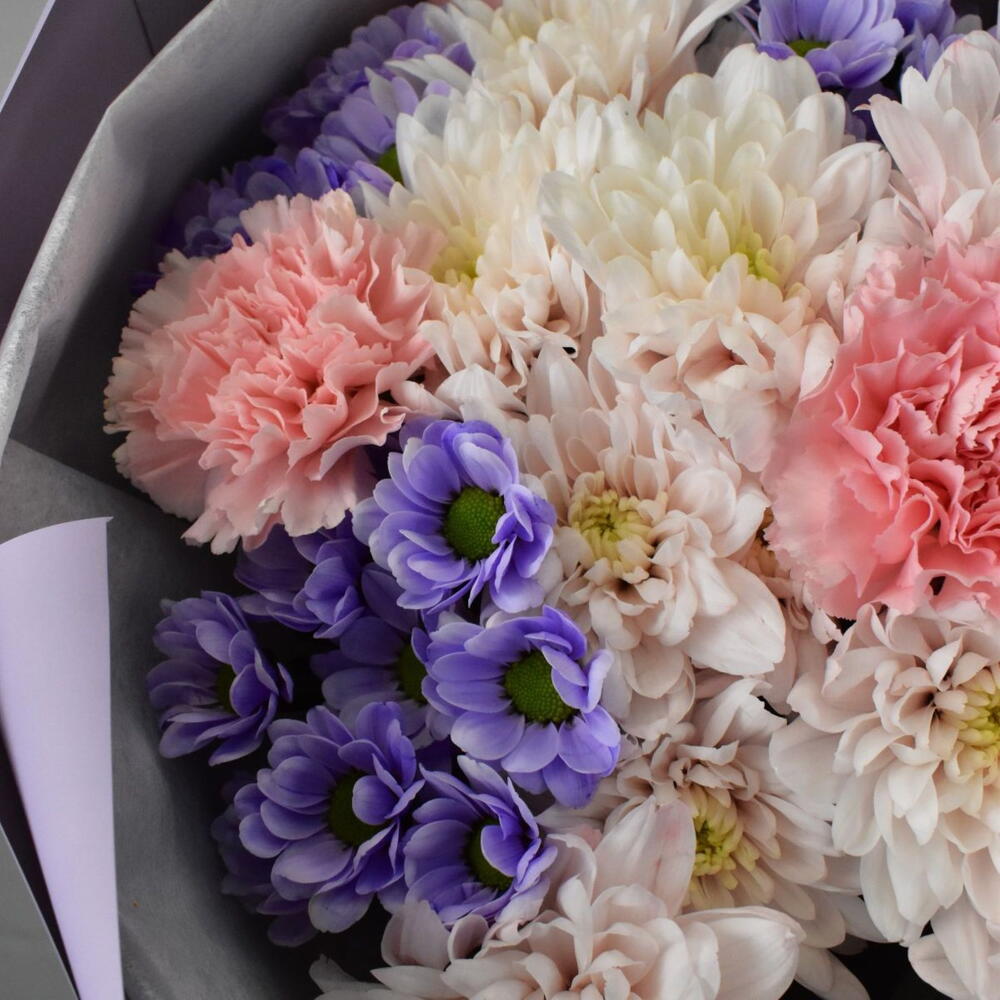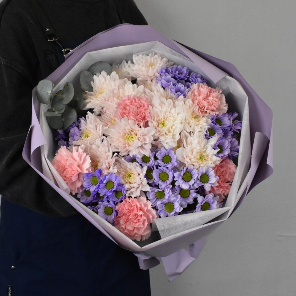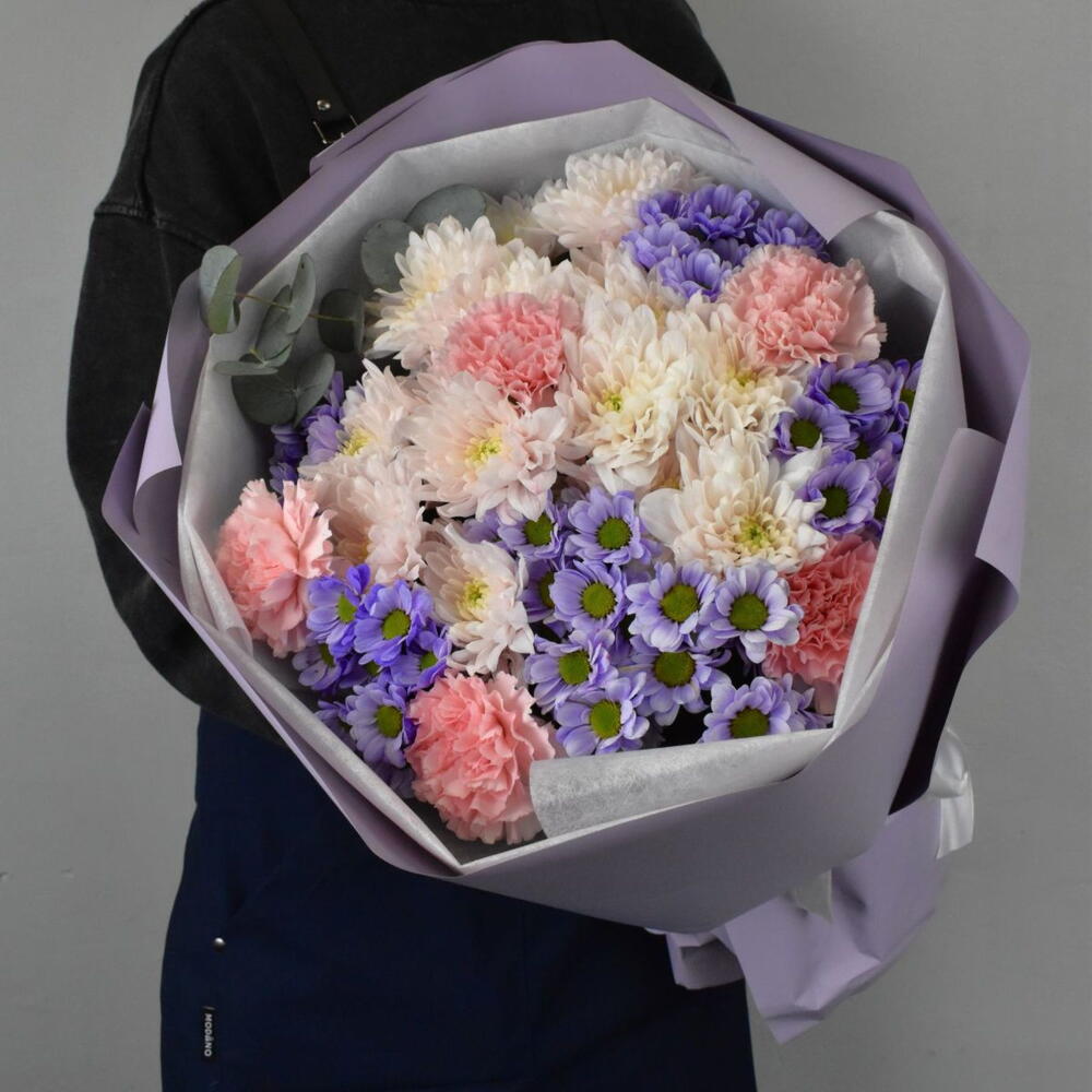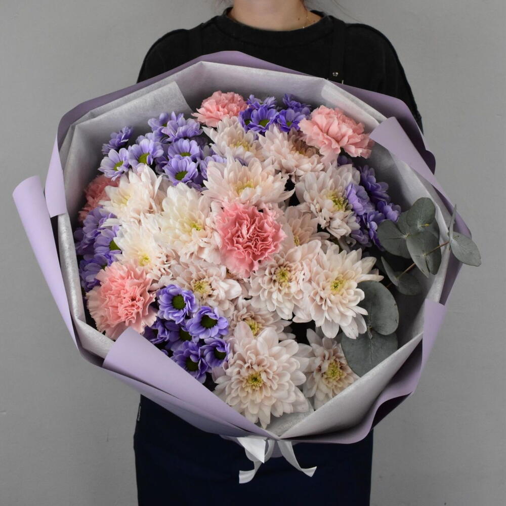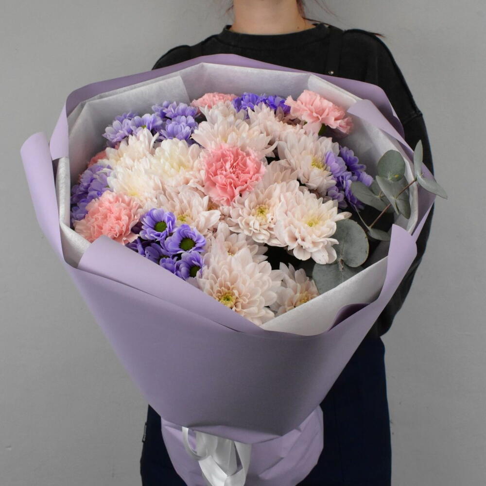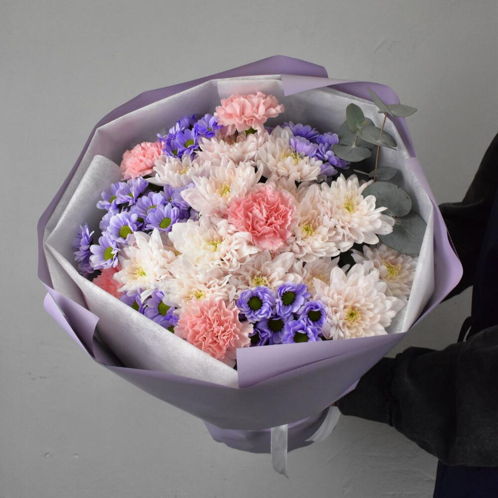 В этом букете прослеживается сочетание нежных оттенков и разнообразие текстур. Сантини создает яркий акцент благодаря насыщенному сиреневому цвету, розовая кустовая хризантема придает букету романтичность и мягкость, гвоздика вносит нотку элегантности, контрастируя с ажурностью хризантем, а эвкалипт добавляет свежести и природного шарма.