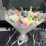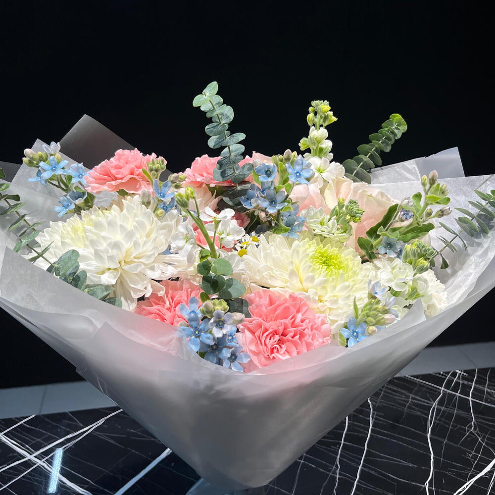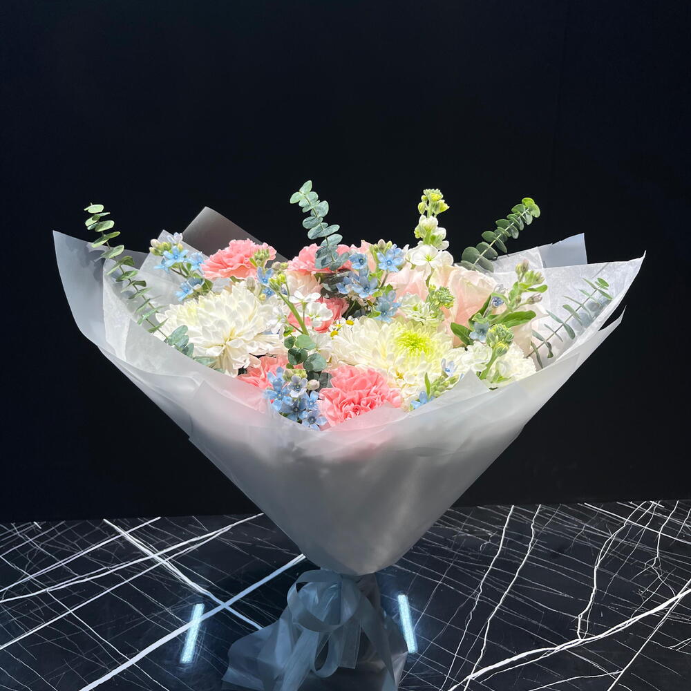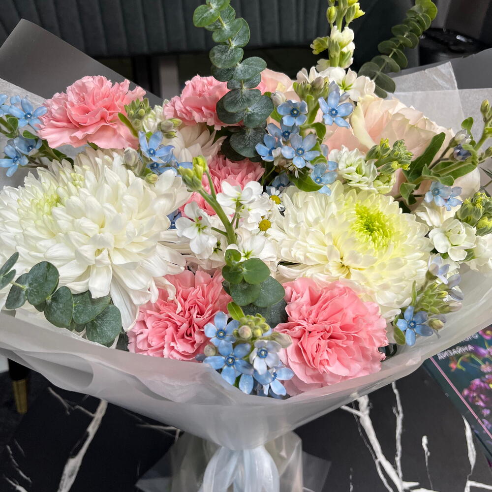 Флора Вайб предлагает авторский букет Для Мамочки — воплощение нежности и утончённости. Авторский букет Для мамочки— настоящее воплощение нежности и заботы, созданный специально для самой дорогой и любимой женщины — вашей мамы. В его композиции гармонично сочетаются крупные белые хризантемы, розовые гвоздики и голубые оксипиталум, которые создают яркий и трогательный акцент. Зелень, обрамляющая цветы, придаёт букету свежесть и естественность, а аккуратная упаковка делает его идеальным подарком для любого случая. Этот букет станет идеальным подарком, который выразит ваши чувства и подарит маме радость и тепло. 💐