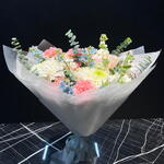 Маттиола - 4 шт. Хризантема одноголовая - 3 шт. Танацетум камилла - 1 шт. Оксипеталум - 6 шт. Упаковка дизайнерская - 1 шт. Гвоздика кустовая Розовая - 5 шт. Открыточка с вашими пожеланиями - 1 шт. Эвкалипт Микс - 2 шт. Роза французская розовая - 2 шт.